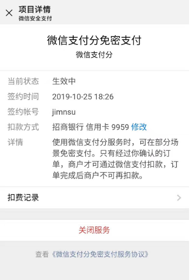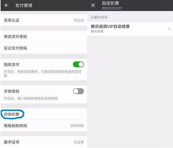 现在使用微信的用户人群越来越多,大家平时除了聊天、视频、发红包之外,还会通过微信进行消费支付。有些人为了图方便,会选择使用微信自动扣费功能,时间一长,自己就忘了,如果后期用不到某一服务,就会白白浪费钱,所以小编建议关闭自动扣费服务。 微信如何关闭自动扣费服务? 微信7.0及以上版本 1、打开手机微信,进入界面,点击【我】——【支付】, 2、进入支付界面,点击右上角的【...】,如图,  3、进入支付管理界面,如图,下拉找到【自动扣费】服务,点击进入,  4、如图,你可以看到目前开通的自动扣费的服务项目,选择需要关闭的项目,点击打开,  5、如图,查看项目详情,点击【关闭服务】,即可解除自动扣费。  微信版本低于7.0 1、打开微信,进入界面,点击【我】——【钱包】, 2、进入我的钱包界面,点击右上角的图标,弹出菜单,选择【支付管理】, 3、点击进入支付管理界面,选择【自动扣费】服务,即可看到已签约的项目,选择需要解约的项目,将其关闭,今后就不会再自动扣费了。  总结:关闭自动续费功能是一项重要的微信管理工作,可以帮助大家节省不必要的开支。想学习了解更多的微信管理方法技巧,请关注wmzhe.com。 -