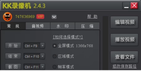 kk录像机一款免费的录像软件,操作简单,适用于所有游戏,录制模式多样化。那它怎么用呢?今天小编就给大家介绍下kk录像机怎么录视频。 kk录像机怎么录视频? 1、打开电脑上安装的“kk录像机”软件,它的操作界面是这样的,如下图:  2、点击软件界面的“常规”,有开始、结束、截图三个按钮,模式也有全屏、区域、帧率三种,如下图:  3、点击软件界面的“音视频”,弹出的是录音选项界面,可以录制电脑播放声,也可以录制麦克风,还可以调整视频亮度和流畅度,如下图:  4、点击软件界面的“水印”,可以调整文字大小,显示图片、文字水印,还可以设置水印的位置,如下图:  5、点击软件界面的“压缩”,可以适当压缩视频,如下图:  6、软件界面右边的编辑功能,可以编辑、播放视频,查看文件,修改保存路径,如下图:  以上就是kk录像机怎么录视频的内容,操作简单,大家可以试试哦。想了解更多精彩教程资讯,请关注wmzhe.com。 38. 你在我身边也好,在天边也罢,想到世界的角落有一个你,觉得整个世界也变得温柔安定了。 -