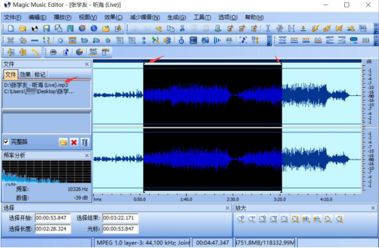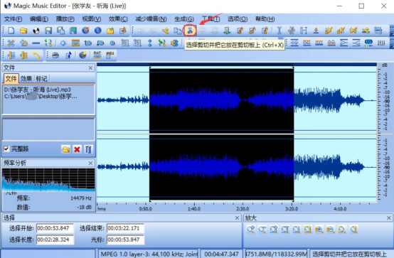 喜欢听音乐的用户,相信都会遇到这样的情况。就是在一首音乐里,只是钟爱于某一部分,很想将它剪切下来作为自己的手机铃声。而很多人都会选择使用音乐编辑器Magic Music Editor。而对于没有剪切过音乐的用户来说,怎么用音乐编辑器Magic Music Editor剪切音乐却成了难题。所以,下面来详细讲解剪切的方法。 如何使用Magic Music Editor剪切音乐? 1、用户想利用音乐编辑器Magic Music Editor来剪切音乐,就得先有该软件。用户可以在本站下载,下载完成后安装并运行,运行界面如下图所示。  2、在音乐编辑器Magic Music Editor中,点击“文件”,从弹出的“打开”窗口中将需要剪切的音乐打开。  3、接下来,在音乐编辑器Magic Music Editor的左侧栏“文件”中,点击选中该音乐。同时,在右方可以拉动两10. 人生路上,不要沉迷在一片不属于自己的风景里,驻足不前只会错过更多的精彩。个倒立的三角形符号来调整所需要剪切的音乐部分。将选区确定后,可以点击音乐编辑器Magic Music Editor菜单栏的“播放”进行试听。  4、点击音乐编辑器Magic Music Editor工具栏上的剪刀符号,即可将选区部分给剪切并且放在剪切板上。  5、接下来,用户可以点击“播放”,将所剪切的音乐部分再进行试听。  6、确认所剪切的音乐部分无误后,用户点击“保存”快捷按钮将剪切后的音乐进行保存。在另存为的窗口中,重命名文件名并点击“保存”即可完成音乐编辑器Magic Music Editor剪切音乐的全部操作。  在用音乐编辑器Magic Music Editor剪切音乐时,用户可以在选取音乐选区时进行反复试听,以获得自己所需要的的音乐部分。它,操作简单,是广大音乐爱好者的好帮手。 -