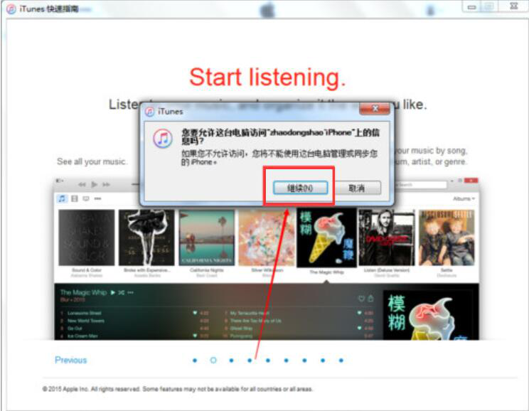 itunes是苹果御用的数字媒体播放应用程序。不仅可以用它来听歌曲,还可以利用它来同步歌曲到手机上,非常的方便。但是,事实上,很多果粉还不太熟悉具体该怎么同步歌曲,所以,下面来讲解下怎么用itunes同步歌曲到手机上。 如何使用itunes同步歌曲到苹果手机? 1、首先,用户需要用数据线将电脑和手机连接起来。如果电脑从来没有连接过苹果手机的话,那么电脑上需要安装驱动程序的,同时,手机上弹出的是否信任电脑的对话框中,选择“信任”。  2、然后itunes便会弹出一个提醒的对话框,点击“继续”,这样,后续itunes同步歌曲到手机上的操作才能成功。  3、接下来,在“账户”菜单项中,选择“对这台电脑授权”,否则,用户是无法使用itunes的。  4、在弹出的“对这台电脑授权”的对话框中,自行输入Apple ID和密码,再点击下方的“授权”按钮。  5、授权成功后,用户接着要进行导入的操作。点击“文件”,再点击其下拉菜单中的“资料库”,选择“导入播放列表”的子菜单。  6、从播放列表中,将需要同步到手机上的歌曲导入到itunes的资料库中。  7、想要itunes同步歌曲到手机上,用户还需要点击主界面菜单栏下的手机图标,从而进入下一步的操作。  8、在用户苹果手机的信息栏处,点击“音乐”,然后在其右边勾选“同步音乐”,再点击界面右下方的“同步”按钮,itunes便开始执行同步歌曲到手机上的操作命令。最后,用户将手机打开,就会发现歌曲已经同步了。  苹果用户想要itunes同步歌曲到手机上,必须要先将资源导入itunes,而且一部苹果手机每一次只能和一个itunes同步,以保证苹果用户的设备安全。 -
