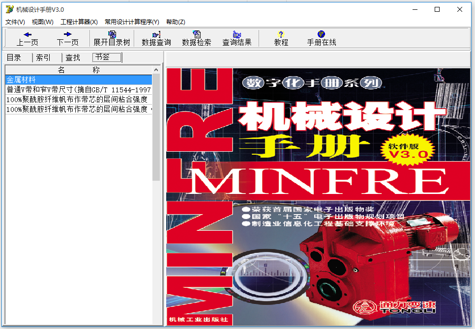 机械设计手册电子版,这是一款适合机械工程师使用的学习软件,内置丰富的机械设计知识,包括各种数据、图表,可以帮助用户更好进行机械设计工作。本文简单整理了下载安装以及使用机械设计手册的一系列流程,大家可以参考。 如何安装使用机械设计手册? 从本站下载,解压压缩包,打开文件夹,找到并双击Setup.exe,弹出界面,根据提示进行安装,      软件安装完成,双击运行,如图,界面非常简约,左侧是目录区,右侧是数据资料区,点击【目录】中的任意一项,即可展示相关资料说明,  在数据资料区域双击鼠标,即可全屏,再次双击鼠标,可以恢复正常显示窗口;另外,你可以将资料显示窗口进行分割,便于同时显示数据和图形。 如果你需要经常查看某些内容,可以将其添加到【书签】,方便后续进行查找,也可以删除书签中的多余内容,  点击上方的【查找】功能,输入关键词,即可在所有目录中查找相关信息,可以在全部文件中查找数据,  当然了,机械设计手册还支持【数据查询】、【数据检索】功能,点击【数据查询】,弹出对话框,输入关键词,点击【查询】,查找目标信息,  机械设计手册是依据国家和行业标准汇编而成,所有内容会及时更新,有需要的小伙伴可以下载使用。想了解更多精彩教程资讯,请关注wmzhe.com。 -