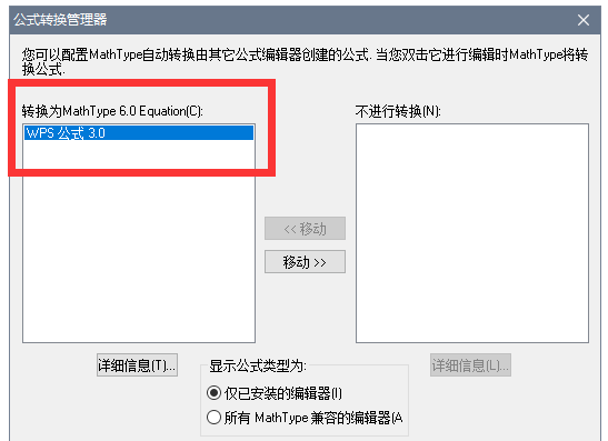 Mathtype是一款可以和Office软件相互兼容、配合使用的数学公式编辑器,它的出现帮助大家解决了编辑复杂公式的困扰。为了方便办公,小编建议大家将Word自带的公式编辑器换成MathType,以后就可以直接使用MathType编辑公式。 如何将Word自带的公式编辑器切换成MathType? 从本站下载Mat14. 因为我知道你是个容易担心的小孩,所以我将线交你手中却也不敢飞得太远。htype数学公式编辑器,根据提示进行安装,  软件安装完成,然后呼出开始菜单,找到MathType文件夹,点击展开,选择公式转换管理器,如图,  然后打开公式转换管理器,如图,在右边的【不进行转换】方框中显示的是WPS公式3.0,  点击中间的【移动】选项,即可将WPS公式3.0移动到左边方框中,如图,  接着新建一个Word文档,在菜单栏中点击【插入】——【公式】,即可调用MathType公式编辑器,这里还有提示,点击确定即可,  如果想切换WPS自带的公式编辑器,只需在菜单栏点击【插入】——【对象】,弹出面板,选择WPS公式3.0,点击确定,即可成功调用。   根据上述方法进行操作,你就可以将WPS自带的公式编辑器切换成MathType。想了解更多精彩教程资讯,请关注wmzhe.com。 -