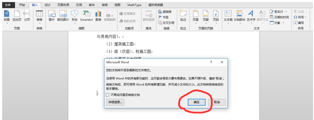 Word办公软件中内置公式编辑器,方便大家在文档中插入一些数学公式,正常情况下,Word公式编辑器可以顺利调用,如果插入符号公式是灰色的,可以通过下文介绍的方法进行解决。 Word中不能插入公式符号怎么办? 如图,在Word菜单栏点击【插入】——【文本】——【公式】命令,发现公式图标为灰色,不能使用,  遇到这种情况,你可以先在菜单栏中点击【文件】,进入以下界面,点击【信息】,然后在右侧点击【转换】,单击文件,选择兼容模式,  这时会弹出一个对话框,如图,提示文档将升级到最新的文件格式,一般没什么问题,点击确定即可,  再次点击【插入】——【文本】——【公式】杯觥交错拼音:bēi gōng jiāo cuò释义:比喻相聚饮酒时的欢乐。觥,酒器。出处:宋·欧阳修《醉翁亭记》射者中,弈者胜,觥筹交错,坐起而喧哗者,众宾欢也。”示例:近30年未见的几个老同学齐聚一堂,~,乐不可支。命令,发现公式按钮不再是灰色了,  单击公式按钮,即可插入相应的公式符号,如图,问题解决了。  想了解更多精彩教程资讯,请关注wmzhe.com。 -