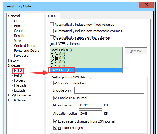 作为一款专业智能的文件搜索工具,Everything提供了多种搜索方式,可以帮助用户“瞬间”定位目标文件,除此之外,软件还有高级玩法——搜索离线文件。简单来说,就是通过Everything来查找U盘、移动硬盘等设备中的文件,而且,不用将U盘、移动硬盘与电脑连接。 如何使用Everything的离线文件搜索功能? 1、将U盘或者移动硬盘接入电脑,  2、打开Everything软件,建立离线索引数据库,依次点击【Tools】——【Options】选项,  3、弹出窗口,点击展开Indexes(索引),选择保存目录,根据图中提示操作,  4、然后点击【NTFS】,选择刚才插入电脑的移动设备,以这个SAMSUNG硬盘为例,设置完成,点击OK,软件即可自动生成索引目录,  注意:索引过程比较快,就算是1TB的移动硬盘,只要几分钟就能建立索引。 5、等待索引完成,点击OK,回到Everything软件主界面,在菜单栏中点击【File】——【Export】选项,  6、出现对话框,设置文件名称,最好是和硬盘名字一样,点击【保存】,即可导出保存索引文件,  7、现在弹出硬盘,然后在Everything搜索栏中输入关键词,例如“华为工具箱”,即会立刻出现结果;另外,在搜索过程中的过滤结果都是直接呈现,  总结:只要储存了U盘、移动硬盘等设备的检索数据库文件,即使你将移动设备移除,今后也可以在不连接设备的情况下使用Everything搜索文件!想了解更多精彩教程资讯,请关注wmzhe.com。 -