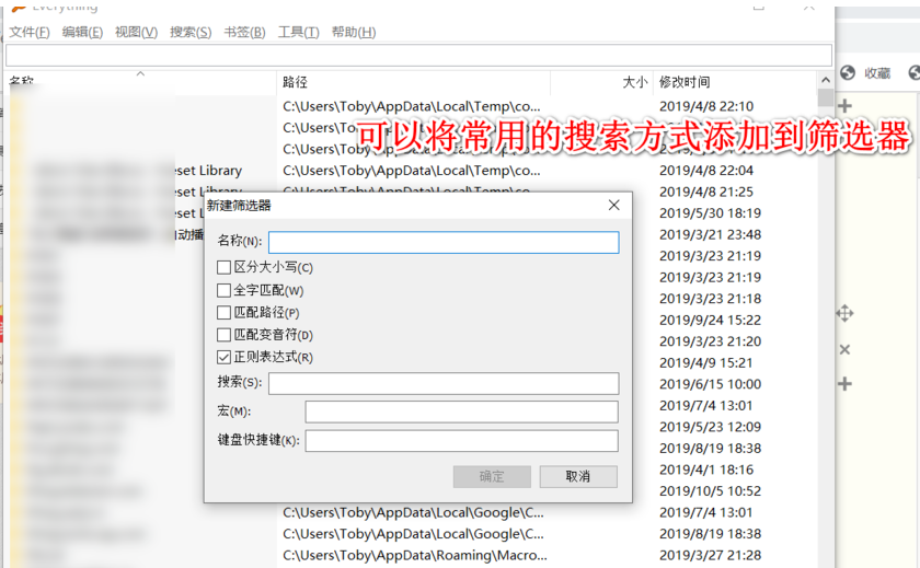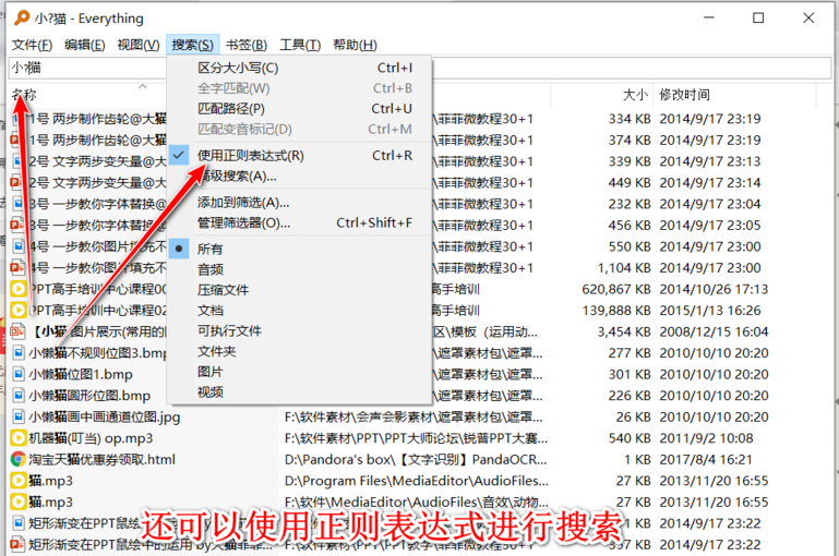 如果你只依靠Windows系统自带的文件搜索功能,就想在短时间内查找目标文件,无疑是很困难,毕竟电脑中堆积了大量文件!反之,使用Everything搜索文件的速度非常之快,很多时候只要1秒即可定位目标文件,你是不是很惊讶呢?  打开Everything软件,第一次使用软件,它会花点时间来建立全盘文件索引,然后列出所有的文件,  在方框中输入关键词,例如完整的文件/文件夹名称(或者一部分名称),软件即可列举相关文件,  此外,在菜单栏中点击【搜索】——【使用正则表达式】,通过正则表达式进行文件检索,能够提高文件搜索的速度和准确度,  如果你并不熟悉正则表达式,还可以使用高级搜索功能,设置多个条件进行定位,准确查找自己43. 分手后你哭了那是你脆弱,分手后你笑了那是你的本事。需要的文件,  如果你会经常用到某些文件或者搜索方式,可以设定规则并添加到筛选器,方便下次直接调用,  当然了,如果你知道文件的类型或者扩展名,可以直接输入扩展名进行搜索,非常方便!  Everything软件提供了多种文件搜索方式,适用于各种情况,充分满足用户需求。想了解更多精彩教程资讯,请关注wmzhe.com。 -