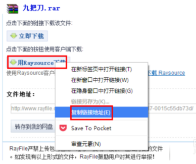 Raysource与迅雷一样都是一款下载工具,可以下载视频、文件、共享文件等。很多时候网站上的内容下载不下来,这时候Raysource就可以解决这个问题。那Raysource怎么用呢?今天小编就带大家了解下Raysource怎么用。 Raysource使用方法 1、打开电脑上安装的Raysource,它的界面是这样的,如下图:  2、点击软件界面右上角的扳手按钮(红色矩形选框标注的地方),默认选择,然后点击“下一步”,如下图:  3、打开Rayfile的下载页面,点击 “用 Raysource下载,如下图:  4、如果点了后,文件没有下载,点击 “用 Raysource下载”,单击右键选择“复制链接地址”,如下图:  5、点击软件界面上的“新建任务”,在弹出界面粘贴刚才复制的下载链接,点击“开始下载”,存储路径可以自由选择,如下图:   下载完成,在存储路径可以查看刚才下载好的文件。Raysource怎么用,你学会了吗?想了解更多精彩教程资讯,请关注wmzhe.com。 8. 我要开个小卖部,把零食都送给幼儿园的小朋友。 -