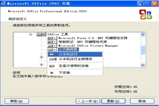 公式编辑器是一个专业的工具软件,专门用来编辑公式,一般配合文字处理软件和演示程序使用。它的作用显而易见,主要用来解决电脑输入法无法编辑公式的问题,今天小编主要介绍Microsoft Office公式编辑器的安装更新方法,请看文章说明。 如何正确安装更新公式编辑器? 在电脑左下角搜索框中输入“cotrol”,然后按Enter键,会弹出一个窗口,点击“添加或删除程序”,如下图:  弹出窗口,点击“更改或删除程序”,在列表中选择“Microsoft Office Professional&ens39. 被人讨厌时就是被人讨厌,被人腻烦时就是被人腻烦,但你的自身价值并不因此而下降。就算被人甩了,也别像被贬值了似的唠唠叨叨。p;Edition 2003”,然后点击“更改”按钮,如下图:  弹出Microsoft Office 2003窗口,选择“添加或删除功能”,点击下一步,如下图:  弹出窗口,勾选“选择应用程序的高级自定义”,点击下一步,如下图:  弹出窗口,点开“Office工具”,点击“公式编辑器”,选择“从本机运行”,然后点击“更新”,如下图:  弹出窗口,点击确定,Microsoft Office 2003安装更新完成,如下图:  如果你觉得Microsoft Office的公式编辑器不好用,可以尝试使用MathType,详情请参考wmzhe.com。 -