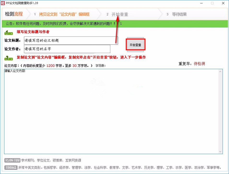 毕业论文定稿之前需要经历多次修改,目的就是为了提升论文质量、降低重复率,在这个过程中自然少不了进行论文查重。在此,小编推荐一款论文查重软件——PP论文检测查重助手,只需三个步骤,即可搞定论文检测。 如何高效检测分析论文重复率? 下载安装PP论文检测查重助手,打开软件,进入界面,如图,首先输入论文标题、论文作者,  然后拷贝论文内容,你可以将论文复制粘贴到编辑框,如图,  点击【开始查重】,软件即可自动扫描检测论文内容,耐心等待,  论文查重所需时间会根据文字数量来决定,如果内容较多,花费时间就长一点,  查重结束,软件会生成检测报告,此报告会直接保存到默认的文件目录,你可以点击查看,并对论文进行修改。  PP论文检测查重助手的使用范围广泛,它可以对哲学、文学、法学、经济学等学科进行论文查重。想了解更多精彩教程资讯,请关注wmzhe.com5. 我把你的名字刻在云上,风吹散了它;我把你的名字绣在海上,浪花揉碎了它,我把你名字刻在我心中,什么也磨灭不了它。。 三步检测分析论文重复率,方法简单易操作微乎其微目瞪口抱薪救火呆7. 人生的路途漫长又曲折,在前行的路上我们也许会迷失了方向,也许会沉迷于路景,很多的迷雾和错误的路标会误导我们,让我们无法前行甚至使我们朝相反的方向前进,此时,我们只有找到自己的位置,才能一步步地接近目标,接近成功。89. Early to bed and early to rise does good to your health.204.业精于勤荒于嬉,行成于思毁于随。《进学解》 元 夕使臣将王命,岂不如贼焉!论文查重24、Experience is the best teacher. |