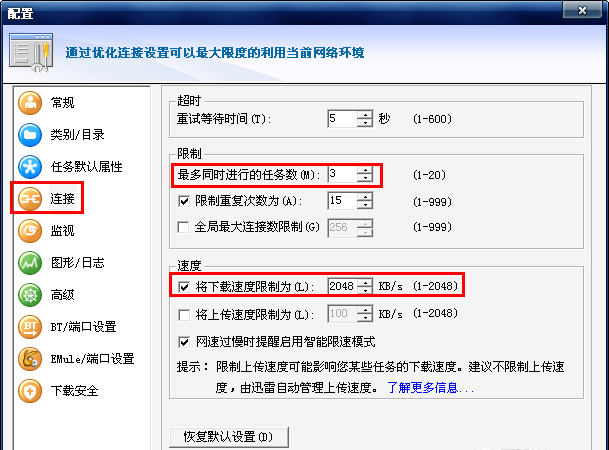 虽然迅雷5是一个旧版本的下载软件,但是它具有界面简洁、下载速度快等特点,依然备受大众欢迎。迅雷5安装完成,大家需要先进行相应配置,然后下载文件资源,以此提高使用体验。 如何安装配置迅雷5? 从本站下载安装迅雷5,这里要注意软件捆绑,大家自行决定是否勾选。 安装完成,打开软件,界面如图,点击【配置】按钮,  打开配置对话框,点击【类别/目录】选项,迅雷默认的下载位置在C:\TDDOWNLOAD\目录,将其进行修改,然后点击【应用】,保存更改,  点击【任务默认属性】选项,修改【原始地址下载线程数】,设置数值为10,  点击【连接】选项,将【最多同时进行的任务数】17. 一生情,蜿蜒成潺潺的溪水,向着爱海奔腾而去;一生爱,辗转成绵延的相思雨,踏落一路红尘的情趣;我的爱总是为了你,把你留在我香甜的梦境里!修改为3,因为同时下载的文件太多会影响下载速度;勾选【将下载速度限制为】,设置数值为2048,  点击【BT/端口设置】选项,将【下载完成后持续上传时间】修改为【手动停止】,因为BT下载完成后还会持续上传一段时间,这会影响电脑运行速度和其他文件的下载速度,  点击【下载安全】选项,取消勾选【下载后自动杀毒】,  全部设置完成,点击【确定】按钮,关闭配置对话框,回到软件主界面,在菜单栏中点击【工具】——【系统优化工具】,  打开XP系统优化工具对话框,修改【你的当前连接数为】,改成1024,点击【修改连接数】按钮,确定,重启电脑,  至此,迅雷5.8.14.706软件配置完成,你可以开始下载文件了。想了解更多精彩教程资讯,请关注wmzhe.com。 -