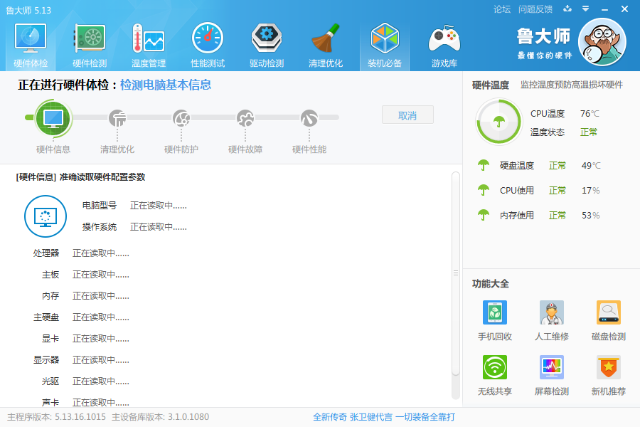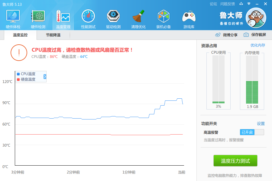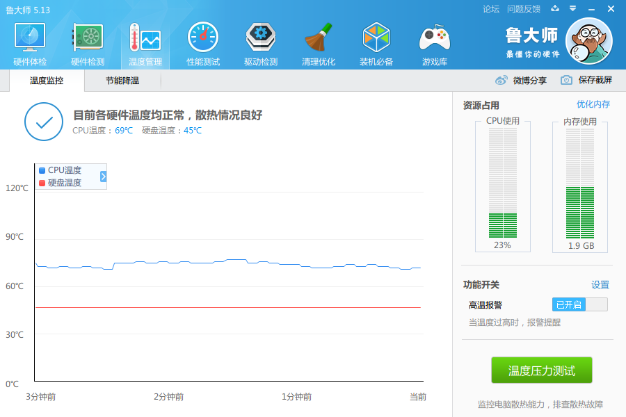 日常办公,大家一定要养成定期优化清理电脑的好习惯,不能每次都等到发生问题才想起来进行维护。鲁大师是众多用户推荐的一款电脑安全29. 春有百花,秋看月。夏有凉风,冬有雪。心中若无烦愁事,便是此生好时节!防护软件,它可以实时监测系统,保障电脑正常运行。 如何使用鲁大师进行电脑优化维护? 打开鲁大师,进入界面,如图,点击【硬件体验】,耐心等待,  体检完成,罗列了电脑中存在的所有问题,如图,点击【一键修复】,  如果存在问题,点击【一键修复】,基本可以解决问题,如果你不放心,可以点击【重新扫描】,  点击【温度管理】,你可以看到硬件的温度信息,夏天温度较高,电脑使用时间过长就会发烫,你可以实时查看CPU温度、硬盘温度,以防遇到特殊情况,  接着来说说【温度压力测试】,这个功能可以测试你的电脑是否需要更换硬件,也可以测试电脑能否玩游戏,检测过程中出现问题就会报警,说明你需要更换风扇或者硬件!   点击【性能测试】,你可以通过测试结果大致了解电脑性能,然后考虑是否需要更换硬件,  点击【驱动检测】,可以及时发现设备驱动问题,并进行解决修复,  如果你的电脑中还没有安装鲁大师,可以直接从wmzhe.com进行下载。 -