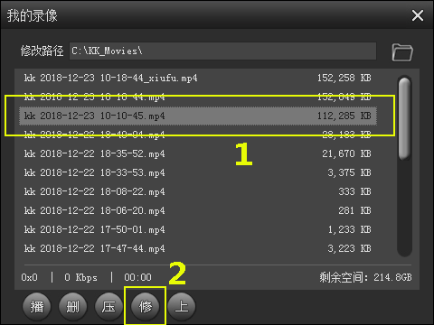 一般来说,使用KK录像机可以正常录制视频,几乎没有难度,但是我们偶尔也会遇到特殊情况。例如录屏中断、KK录像机录制视频卡顿,无妨,下文整理了具体解决方法,帮助大家解决困扰。 KK录像机录制或播放视频很卡? 大家需要知道的是,KK录像机采用了一边录制一边压缩的方式进行录屏,在录制视频过程中需要占用一部分系统资源,如果你的电脑分辨率超过1920x1080,录制或播放视频可能出现卡顿,解决方法如下: 方法一 从2.8.1.3版本开始,KK录像机支持硬件加速功能,点击【设置】,进入界面,选择【常规】——【开启硬件加速】;如果没有该选项,可能是因为你的显卡驱动版本过低,建议更新显卡驱动;如18. 还有一部分失恋的人会检讨不足总结经验教训,为下一次展开行动前将自己做好质的转变。恋爱叫人不寂寞,等你以此为功德去造福人类了,也算是现代都市公德一件了。果显卡驱动已更新,还是找不到该选项,说明你的显卡不支持硬件加速,可以采用方法二。  方法二 1、降低屏幕/游戏分辨率,如调成1024x768;关闭无关软件和一些占资源的游戏效果,如降低游戏多重采样和部分渲染效果。 2、降低KK录像机的流畅度,选择中或低,同时稍微降低视频流畅度,能够缓解卡顿现象。 3、设置录制视频清晰度为标清,这种状态会降低对游戏的影响,同时录制的文件也小很多。 如何修复视频文件? 视频录制过程中可能会出现一些突发状况,导致录制中断,使得录制的视频文件损坏。从KK录像机2.8.3版本开始,软件增加了修复功能,可以修复破损视频,注意,新版软件无法修复旧版软件录制的破损视频。 1、打开KK录像机,进入界面,点击【我的录像】,  2、选中需要修复的视频文件,点击下方的【修】,切记,不能修改文件名,否则无法修复,  3、弹出对话框,点击【修复】,开始修复视频,等待进度条100%,软件会自动打开文件所在目录,可以看到修复生成的视频文件。  如果你对于KK录像机的使用存在其他疑问,可以参考wmzhe.com的相关教程。 -