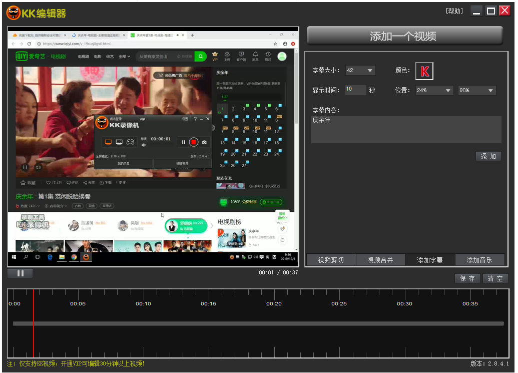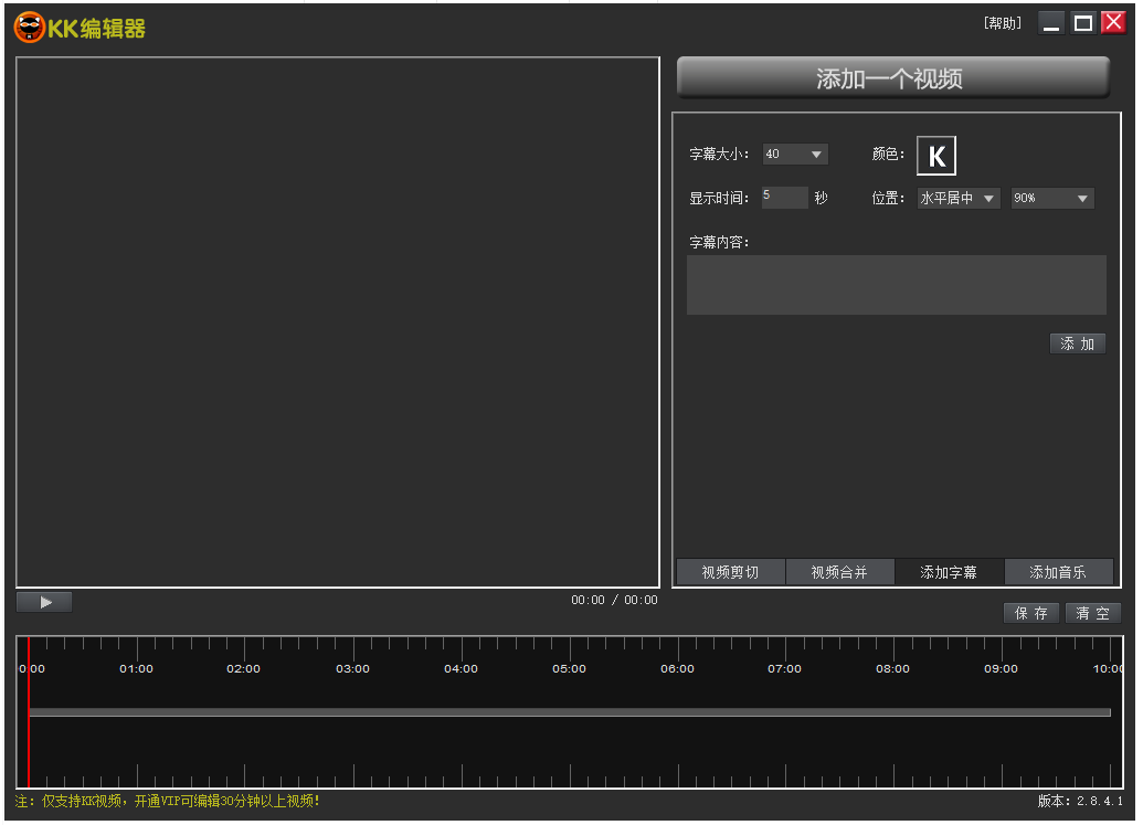 KK录像机不仅支持电脑录屏功能,还可以进行简单的视频编辑,录屏完成,你可以对视频文件进行细节处理,使其更完美。今天下面小编就来介绍如何使用KK录像机编辑视频,大家可以了解学习。 如何使用KK录像机编辑视频文件? 打开KK录像机,进入界面,点击【编辑视频】,  打开KK编辑器,如图,这里有【视频剪切】、【视频合并】、【添加字幕】、【添加音乐】功能,小编选择的是【添加字幕】,  点击上方的【添加一个视频】,导入之前录制的视频文件,视频导入成功,如图,  输入字幕内容,设置字幕大小、颜色,选择字幕显示位置、显示时间,垂头塞耳拼音:chuí tóu sāi ěr释义:指不问不闻,装聋作哑。出处:《后汉书·殇帝纪》刺史垂头塞耳,阿私下比,‘不畏于天,不愧于人’。”示例:谏诤之徒,以正人君之失尔,必在得言之地,当尽匡赞之规,不容苟免偷安,~。★北齐·颜之推《颜氏家训·省事》点击【添加】,KK录屏视频中已经成功添加了字幕。  注意:开通KK录像机VIP会员,即可成功编辑30分钟以上视频。想了解更多精彩教程资讯,请关注wmzhe.com。 -
