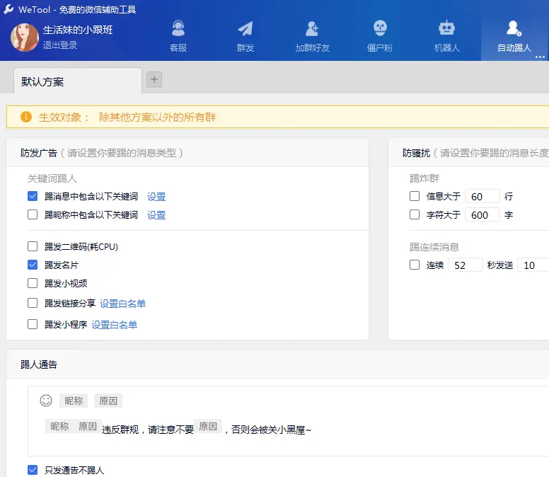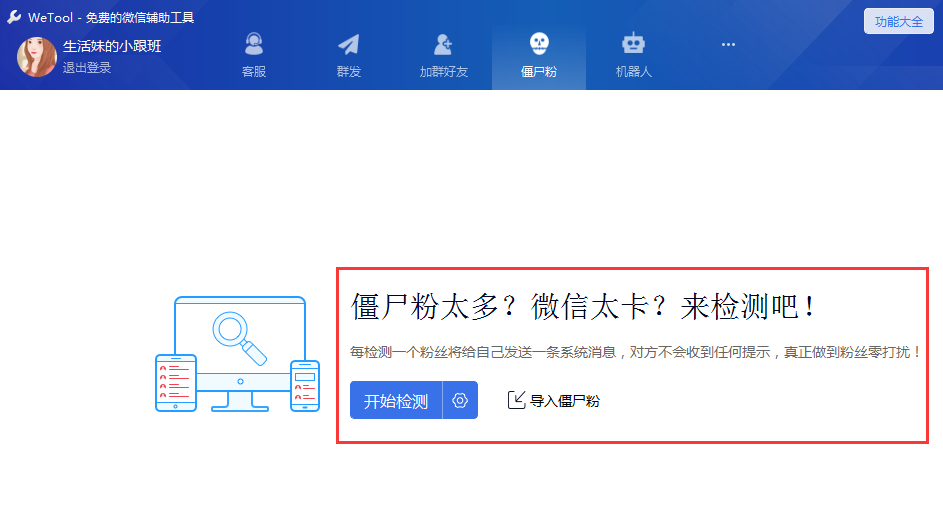 对于微商群体来说,批量加好友、群发消息是他们每天都要做的事情,如果仅仅是靠自己手动操作,可想而知,很费时间,效率也太低了!你需要一款软件来帮忙,小编推荐WeTool,这是一款多功能的微信管理软件,可以充分满足你的需求。 WeTool三大功能说明 关键词拉群 打开WeTool,登录账号,进入界面,点击【功能大全】——【关键词拉群】——【添加】,设置关键词,添加群对象,   设置完成,效果如下, 寸步难移拼音:cùn bù nán yí释义:连一步都难移动。形容走路困难。也比喻处境艰难。出处:元·郑廷玉《楚昭公》第四折想当年在小舟中,寸步难移。”示例:无 等待几秒,就会收到一条群邀请的自动回复,  通过这种方法可以在短期内快速创建新群,大大提高了群主的工作效率! 自动踢人 因为微信群人数众多,为了便于管理,群主会制定一些规定,如果有人违规,你可以将他剔除。WeTool支持自动踢人,你可以选择踢名片、视频、小程序、二维码、链接,这是一个特别人性化的功能。  几十个微信群,群规各不相同,你可以设置多个踢人规则,只需要添加方案,分开管理即可。  检测僵尸粉 清除僵尸粉,这是所有人都想要的一个功能,以往,有人会去淘宝付费买软件进行检测,真的没必要!!!WeTool可以自动检测僵尸粉,然后进行批量删除,整个过程不会打扰到对方!    注意,该功能有一个缺点,检测完成,你的微信上会冒出很多老友,显示“你已添加了xxx,现在可以开始聊天了”,而且,之前的聊天记录依然存在!  当然了,WeTool支持的功能还有很多,如果你有兴趣,可以关注wmzhe.com的相关教程。 -