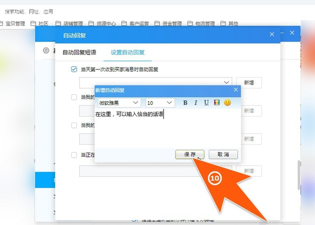 我们找淘宝客服咨询问题,刚刚提问,下一秒立刻弹出消喙长三尺拼音:huì cháng sān chǐ释义:喙嘴。嘴长三尺。形容人善于辨说。出处:《庄子·徐无鬼》丘愿有喙三尺。彼之谓不道之道,此之谓不言之辩。”示例:无息内容,速度杠杠滴,其实这是因为商家设置了自动回复,避免顾客长时间等待答复。如果你是新手卖家,不知道如何在千牛工作台设置自动回复,可以参考以下方法说明。 千牛工作台如何设置自动回复? 打开千牛,登录账号,进入界面,点击右上角的主菜单图标,如图,点击【系统设置】,  进入系统设置界面,点击【接待设置】——【自动回复】,然后点击右边的【自动回复】按钮,  打开自动回复窗口,点击【自动回复短语】——【新增】,在对话框中输入文字内容,设置文字字体、字号,还可以添加表情,点击【保存】即可,  你也可以点击上方的【设置自动回复】,选择启用自动回复的指定情况,进行勾选,点击【新增】,  打开新增自动回复对话框,输入文字内容,点击保存,  对于淘宝商家而言,设置自动回复既可以提升客服工作效率,还能给顾客一个好印象,何乐而不为!想了解更多精彩教程资讯,请关注wmzhe.com。 -
