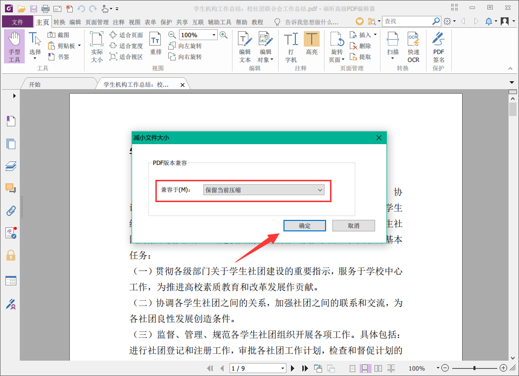 如果PDF文件体积过大,必然会影响文件保存、占用硬盘空间,而且也不方便传输,这时最好的办法就是压缩文件。压缩PDF文件需要借助专业软件,下文介绍了两种操作方法,大家可以任选其一。 如何快速压缩PDF文件? 方法一、福昕PDF编辑器 1、打开福昕PDF编辑器,进入界面,导入需要处理的PDF文档,  2、点击【文件】——【减小文件大小】,如图,  3、弹出【减小文件大小】对话窗,选择PDF版本兼容,默认保留当前压缩,之后点击确定,  4、弹出另存为存心不良拼音:cún xīn bù liáng释义:存心怀着某种心思或打算。指存着坏心眼。出处:清·吴趼人《二十年目睹之怪现状》第一百六回他不服查账,非但是有弊病,一定是存心不良的了。”示例:无窗口,选择PDF文件保存目录,点击保存即可。  方法二、在线工具 如果你的电脑中没有安装福昕PDF编辑器,可以直接通过在线工具来压缩PDF文档, 1、搜索并打开PDF365.cn网站,进入平台,点击【PDF压缩】功能,如图,  2、然后点击【选择文件】,导入需要处理的PDF文件,  3、文件导入成功,点击【开始压缩】,等待压缩完成,即可下载保存文件。  需要注意的是,PDF365.cn平台仅支持压缩10M以内的PDF文档。想了解更多精彩教程资讯,请关注wmzhe.com。 无损压缩PDF文件的两种方法,真正做到省时高效华比比皆是胆大包天灯初上37. 人生千灯万盏,不如心灯一盏。在这个世界上立足,若是我们想取得一定的曾经,那么我们要少一点胆怯,多一点勇气;少一点自卑,多一点自信;少一点疑虑,多一点信任。事实上,信任本身就意味着勇气和自信。告诉我什么时间你最方便。392.横眉冷对千夫指,俯首甘为孺子牛。《自嘲》 绿头鸭 晁元礼泉壑带茅茨,云霞生薜帷。福昕PDF编辑器,PDF编辑器,编辑器,压缩The danger (problem / fact / truth / point) is that… |