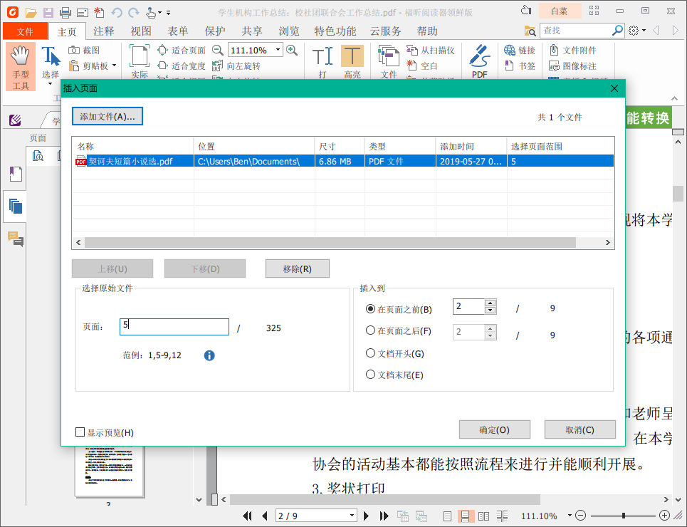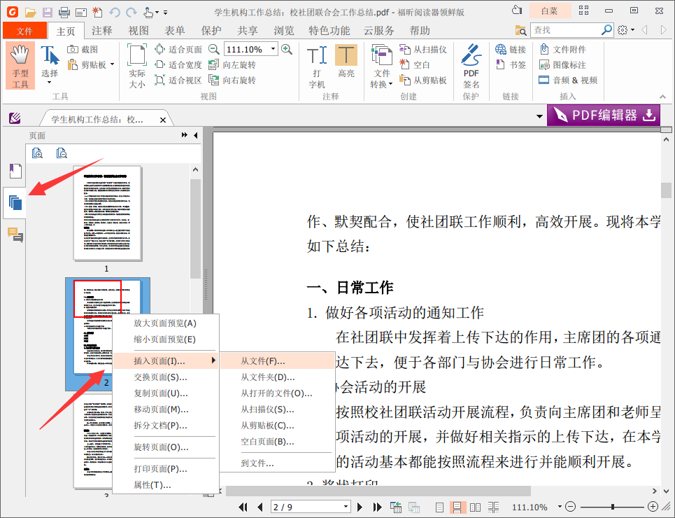 根据领导要求,几个同事针对同一个产品编写了PDF文件,现在需要将几份PDF文件进行合并整理,该用什么方法呢?很简单,使用福昕PDF阅读器可以快速合并PDF文档,具体操作如下。 如何使用福昕PDF阅读器合并PDF文档? 1、打开福昕阅读器领鲜版,进入界面,点击【文件】——【打开】—&mdas38. 离开以后,大声的告诉他:我爱你,与你无关。爱是你的权利,把想说的都说出来,平静的回忆你们的过去,然后哭吧。哭完就把一切都留在昨天,永远不要去触及。h;【最近的文档】,打开需要合并的PDF文件,  2、点击右上角的【未登录】,登录或者注册福昕会员账号,  3、登录成功,点击左侧缩略图,选中任意页面,鼠标右击,选择【插入页面】——【从文件】,从文件插入合并页面,  4、弹出窗口,选择需要合并的PDF文档,然后设置需要插入的页码以及插入位置,点击确定,  5、PDF合并成功了,如图,退出之前记得保存文档。  想了解更多精彩教程资讯,记得关注wmzhe.com。 PDF文件合并方法演示,简单+方便+高效江春回大地朝霞灿烂水茫茫3. 人生是不可能一帆风顺的,关键是你怎样去看待风浪,当你把风浪当成上帝赐给你的雄壮的美景时,你有哪会觉得这就是“逆境”呢?因此,不要因为风浪而结束你的旅程,须知这是上帝赐予的别样的景致,整日的平风浪静又有什么乐趣呢?学者去欣赏它吧,这样,你才能微笑着把船开到彼岸。我一直不断练习,直至我有足够的信心向优秀选手挑战。128.失之东隅,收之桑榆。 丙子送春自从弃置便衰朽,世事蹉跎成白首。福昕PDF阅读器,PDF阅读器,阅读器It is true that (True, / To be sure, / Admittedly,)…, but this is not to say (it is unlikely / it doesn’t follow / it doesn’t mean / it won’t be the case) that… |