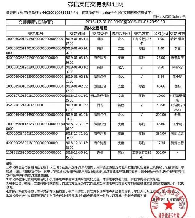 某些时候,我们需要将微信转帐交易记录作为证据材料,这里就有一个问题,如何导出微信交易记录呢?现在小编就教大家一个方法,可以直接调出并下载盖有腾讯公司公章的微信转帐交易记录,具体操作如下文说明。 如何对微信转账交易记录进行取证? 第一步:打开手机微信,进入界面,点击【我】——【支付】功能,  第二步:进入支付菜单主界面,点击【钱包】,  第三步:进入钱包界面,点击顶部【账单】功能,  第四步:如图,进入账单界面,点击顶部的【...】,弹出菜单,选择【账单下载】,  第五步:点击该功能,进入账单下载界面,这里有【用于个人对账】和【用做证明材料】两个选项,其中,【用于个人对账】的账单是Excel表格格式,【用做证明材料】的账单是PDF格式,  第六步:选择一种账单用途,然后选择调取交易明显账单的具体日期区间,最长可调取一年的交易流水,并且支持自定义调取时间。   用于个人对账的清单示例,全部显示在Excel表格中,  用做证明材料的清单示例,  导出微信转帐交易记录的方法介绍结束,你学会了吗?想了解更多精彩教程资讯,请关注wmzhe.com。 -