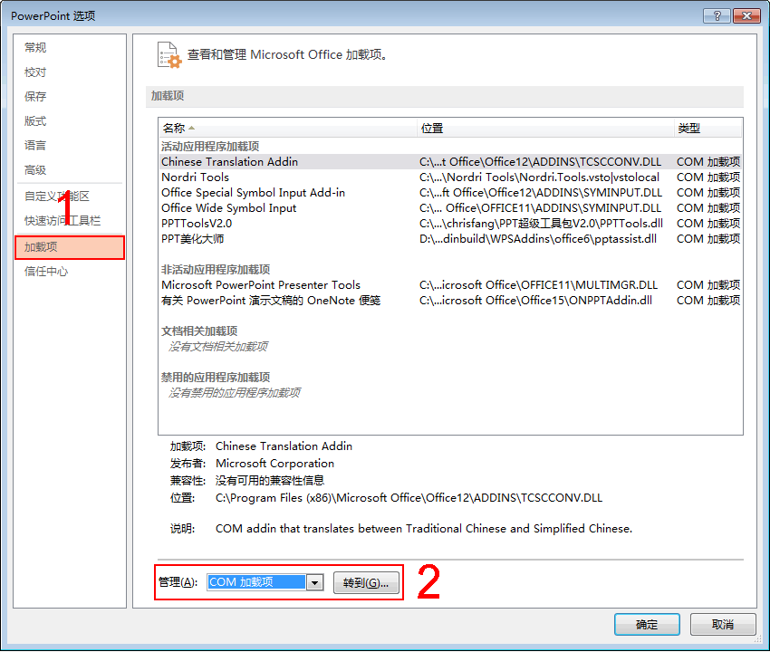 很多人觉得制作PPT很难,既要保证质量,还要提高效率,真是让人头疼,无妨,小编在此推荐一款利器——PPT美化大师。这是一款可以嵌套在Office中的多功能插件,提供海量PPT模板素材,而且持续更新,可以帮助大家轻松制作出漂亮的幻灯片。 PPT美化大师使用常见问题 从本站下载安装PPT美化大师,打开Microsoft Office PowerPoint 2003、2007、2010、2013,如果菜单栏没有【美化】选项卡,没有显示【美化大师】侧边栏,可能是由于以下两个原因造成的: 原因一、美化大师插件可能被Office禁用,需要将插件从禁用项目里移除。 移除禁用项目 Office 2007 1、启动PPT软件,点击打开【PowerPoint选项】,  2、进入PowerPoint选项界面,点击【加载项】,在【管理】选项中选择【48. 你的快乐,我独家赞助:你的痛苦,我独家承受;你的脾气,我独家承受:你的一生,我独家陪伴。禁用项目】,点击【转到】,弹出禁用项目窗口,在列表里选择希望重新启用的项目,这里选择PPT美化大师(pptassist.dll),然后点击【启用】,如图,  Office 2010/2013 1、新建一个PPT文稿,在菜单栏中点击【文件】——【选项】,如图,  2、进入PowerPoint选项界面,操作同上,这里不做详细说明。 原因二、美化大师插件的加载行为被设置为:非启动时加载,需要重新设置插件行为。 设置插件启动行为 进入PowerPoint选项界面,点击【加载项】,在【管理】选项中选择【COM加载项】,点击【转到】,  打开COM加载项窗口,勾选【PPT美化大师】,点击确定即可。  另外,呼出开始菜单,点击【所有程序】——【PPT美化大师】,点击PPT美化大师快捷方式,启动美化大师独立程序,启动时会自动检查和修复美化大师的插件。 如果你想学习更多有关PPT制作技巧,可以关注wmzhe.com。 PPT美化大师使用常见问题整理,附上解决方法手斜风细雨无缚鸡之力草木苍翠32. 在我们的城市里,夏季上演得太长,秋色就不免出场得晚些。但秋实永远不会被混淆的——这坚硬明朗的金属季。让我们从微凉的松风中去任取,让我们从新刈的草香中去任取。74. For another reason, I think it will be much more convenient for you to look after you parents as they are getting old.59.小不忍,则乱大谋。 楼头画角风吹醒,入夜重门静。那堪更被明月,隔墙送过秋千影。顾我无衣搜荩箧,泥他沽酒拔金钗。PPT美化大师,PPT,插件,PowerPoint24.Ill news travels fast. 坏事传千里。 |
