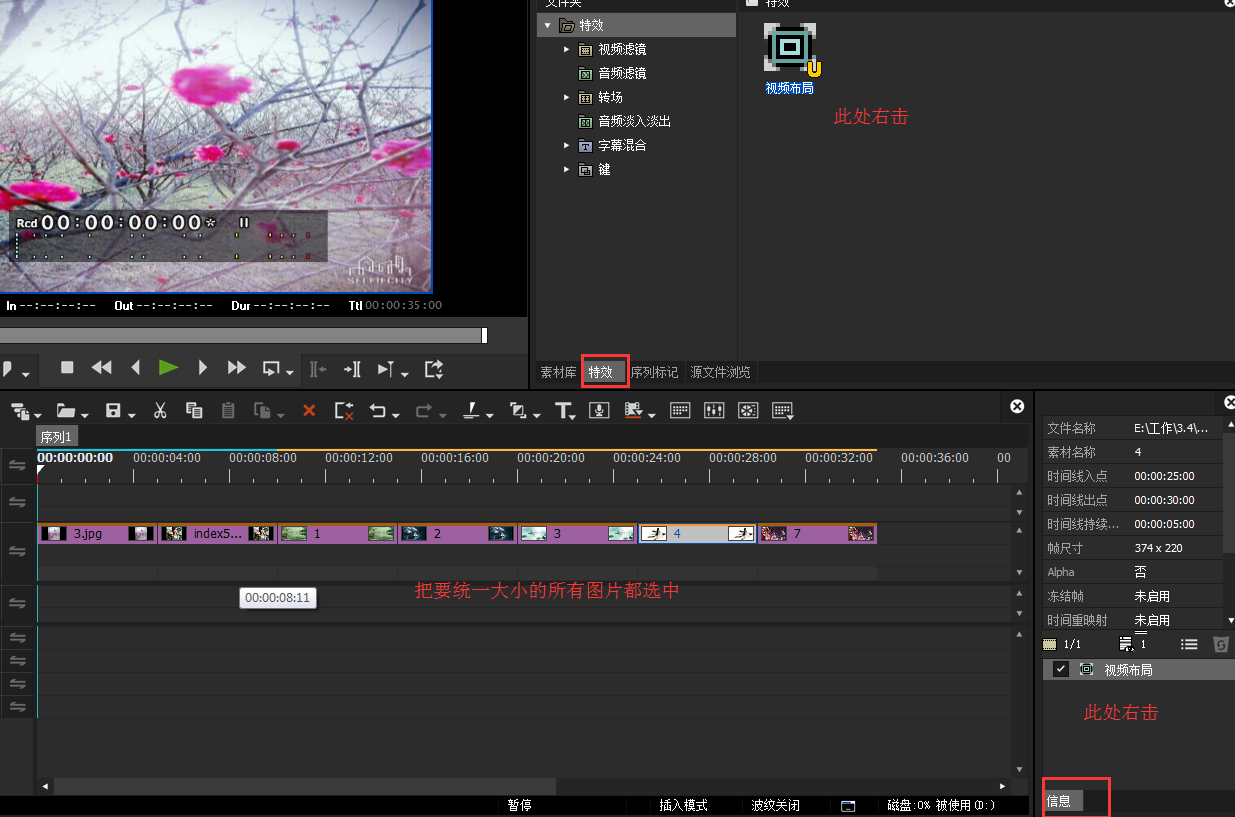 我们平时除了可以使用Edius剪辑视频,还可以用它进行简单的图片处理,小编之前介绍了使用Edius裁剪图片的方法,想必大家已经学习了。今天我们就来学习如何使用Edius批量调整图片大小,具体操作如下,请参考! 如何使用EDIUS批量处理图片大小? 1、打开Edius软件,进入界面,如图,先在素材库窗口添加一些图片,可以看到这些图片的大小是各不相同,  2、将图片拖放置音视频轨道的时间轴上,然后我们随便点击一张图片,双击信息窗口的【视频布局】选项,如图,  3、进入视频布局窗口,如图,点击【参数】——【忽略像素宽高比】,勾选【忽略像素宽高比】,然后点击右侧图标,图片在横竖方向都充满就可以了,  4、点击确定,重新回到步骤二的页面,右击信31. 红尘淡淡,人生如烟,一切的尘缘在冥冥之中都已注定,是喜是悲,都是要走过的,要经历的,我们要懂得;得之,我幸;失之,我命;坦然而过,谈定接受。息窗口中的【视频布局】,然后点击另存为当前预置;接着选中时间轴中的所有图片,点击【特效】,右击【视频布局】,选择添加到时间线,如此一来,所有图片的大小就变得一致了。  整个过程并不复杂,只是需要大家保持细心!如果你想学习使用Edius进行视频处理和图片处理,请参考wmzhe.com整理的相关教程。 EDIUS修图之批量处理图片大小,操作不复杂急来抱佛脚化险狂风暴雨为夷31. 又到草黄时节。遍野的绿色斑驳着消失,只有那干枯的浅黄渐次布满了人的视线,是生命终结时最柔韧的余唱。be regarded as 被认为 / 视作;a means of ……的方式345.养军千日,用军一时。《汉宫秋第二折》 青玉案 苏轼但见新人笑,那闻旧人哭!Edius,图片处理,视频15.Look before you leap. 三思而后行。 |