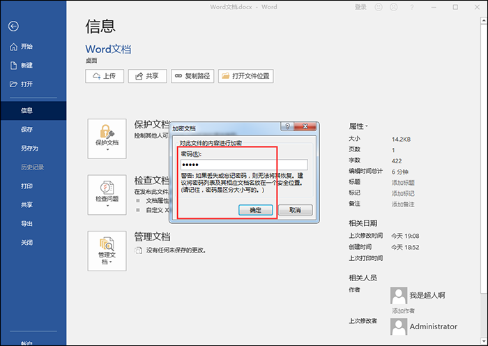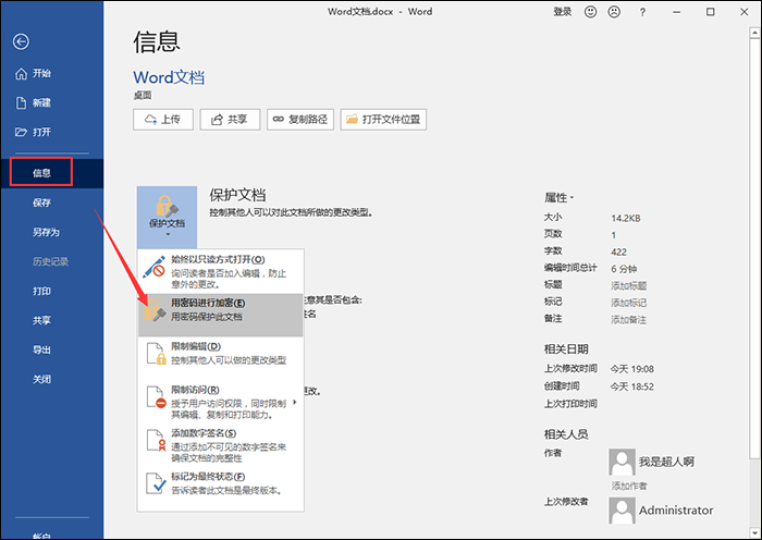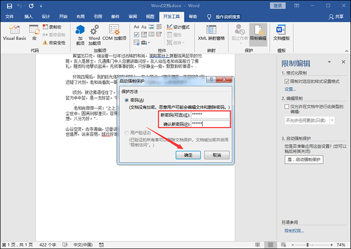 为了保护Word文件安全或者避免他人随意修改自己的文档,我们可以设置加密,在此,小编整理了有关加密Word文档的三种方法,分别适用于不同情况,有需要的小伙伴可以参考本文介绍说明。 如何设置加密Word文档? 方法一:整个文档加密 1、打开Word文档,在菜单栏中点击【文件】——【另存为】,弹出窗口,如图,选择保存在桌面,接着点击【工具】——【常规选项】,  2、弹出对话框,如图,输入打开文件时的密码,点击确定;进入确认密码界面,再次输入密码,点击确定就可以了。  方法二:文档内容加密 1、打开Word文档,点击【文件】——【信息】,如图,在信息界面中点击【用密码进行加密】,  2、弹出加密文档对话框,输入密码,点击确定即可,然后在确认密码界面中再次输入密码,点击确定。  方法三:19. 不敢说出口,因为我胆小,因为如果你拒绝,我以后就不能够再见到你了,宁愿默默的爱着你,不能让你知道,直到,直到你投进别人的环抱!文档格式加密 1、如图,在菜单栏中点击【开发工具】——【限制编辑】,然后勾选【限制对选定的样式设置格式】,  2、接着点击【是,启动强制保护】,弹出启动强制保护界面,输入密码,最后点击确定就可以了。  注意:如果页面中没有开发工具栏,可以点击的【文件】——【选项】,在自定义工具区的主选卡中添加就可以了。 想了解更多精彩教程资讯,记得关注wmzhe.com。 有关Word文档加密的三大招式,你确定知道?心慈面斜风细雨昂首嘶鸣善42. 花越开越密,越开越盛,不久便挂满了枝头。走近看,仿佛是一个个活泼的小喇叭,正鼓着劲儿在吹呢。47. Last but not least, we should make good use of water in our daily life. (2010.福建)冯梦龙364.人逢喜事精神爽,月到中秋分外明。《古今小说》 醉垂鞭,张先双蝶绣罗裙,东池宴初相见。朱粉不深匀,闲花淡淡春。细看诸处好,人人道柳腰身。昨日乱山昏,来时衣上云。明眸皓齿今何在?血污游魂归不得!Word,加密,文档72、Bread is the stall of life. |