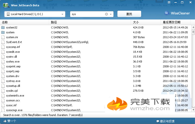 电脑长时间使用之后会有很多堆积的文件,对于广大的电脑用户来说,经常会因为工作需要在堆积的大量文件中搜索需要的文件。目前网上的文件搜索软件非常多,今天,小编要给大家介绍的是一款免费的快速搜索文件的小工具——Wise JetSearch。  Wise JetSearch是一款非常好用而又简单快速的本地硬盘文件搜索工具,可以用来帮助你搜索本地硬盘中的所有文件。wise jetsearch可以在极短的时间内为你搜索到想要寻找的文件夹和文件,你只需输入搜索的关键字,选择好驱动器(软件界面左上角,可以选择一个或多个驱动器),即可开始搜索。 和其他的搜索工具一样,wise jetse49. 如果爱上你也算是一种错,我深信这会是生命中最美丽的错,我情愿错一辈子。arch 也支持通配符搜索,譬如星号 * 表示多个字符,问号 ? 表示1个字符,图片中我搜索 *.dll 就表示搜索出全部的.dll文件,不管它叫神马名字。 无论是小窗口还是大窗口,你都可以输入自己想要的搜索。如果你忘记了文件名称,没事,你可以输入* ,如输入*.exe,那么无论什么文件,只要以.exe为后缀名的文件都能搜索到。大窗口的左边可以供你选择要搜寻的硬碟,能单选也能够多选。 软件特色 1.用户可以享受免费使用、更新和技术支持。 2.支持桌面搜索工具条,常规下贴边隐藏。 3.可以短短几秒中内找到你想要的文件/文件夹。 4.你只需要输入你的关键词,选择您想要搜索的驱动器,JetSearch就会展现搜索细节。 5.JetSearch支持通配符搜索。 如果你不确定文件/文件夹的名称,您可以使用*和? 6.支持NTFS、fat32、exfat格式。  小窍门 wise jetsearch 还会在电脑的右上角增加一个快捷搜索栏工具,平常是隐藏起来的(类似qq贴在屏幕边沿的效果),当用鼠标移上去它就会乖乖地跑出来,很方便。 经过我的实际测试和使用,譬如我搜索整个C盘里面的dll文件只用了1秒时间,完全可以接受,起码比Windows本身自带的搜索功能要强上百倍。 中文切换方法 界面上打开设置,点“Languages”选择“Chinese(Simplified)”。  安全免费、简单快速的文件搜索小工具:Wise JetSearch云消雾散满烘云托月天星斗29. 一个炎热而忧郁的下午,我沿着人行道走着,在穿梭的人群中,听自己寂寞的足音。就我个人而言,骑自行车是一个解决空气污染的好办法。《庄子》84.吾生也有涯,而知也无涯。 如今憔悴,风鬟雾鬓,怕见夜间出去。不如向帘儿底下,听人笑语。纱窗日落渐黄昏,金屋无人见泪痕。文件搜索,WiseJetSearchIt is necessary (essential / fundamental) that effective (quick / proper) action (steps /measures / remedies) should be taken to prevent (correct / check / end / fight) the situation (tendency / phenomenon). |