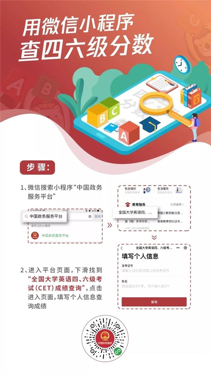 2019年上半年全国大学英语四、六级考试成绩已经出来啦,除了传统的查分方式之外,同学们还可以通过支付宝或者微信来查询成绩,非常方便。下文整理了使用手机支付宝和微信查询四六级成绩的方法,一起来看看吧。 以支付宝为例,输入“中国政务服务平台”或“四六级查分”,找到相关小程序,如图,进入中国政务服务平台小程序,  点击“教育服务”栏目,使用四六级查分功能,输入考生信息,点击“查询”即可,  除此之外,你还可以查询学位证书、普通话水平测试成绩、教师资格考试成绩等等,超级方便。  目前,中国政务平台也已推出微信小程序,下面附上使用微信查询四六级成绩的方法流程: 打开微信,搜索“中国政务服务平台”小程序,进入平台,你可以在热门服务中找30. 聚是缘,散是有缘无份;散了才会有更好的缘和份,散了才会有更美好的相聚;莫伤心,抬起头,看前方,前面是更美丽的曙光。到“英语四六级”,点击进入即可查分,或者在“教育服务”栏目中使用四六级查分功能。   想了解更多精彩教程资讯,记得关注wmzhe.com。 英语四六级成绩已出,用手机一查便知大空前绝后高瞻远瞩言不惭46. 学会欣赏,你便懂得享受;学会欣赏,你便拥有快乐;学会欣赏,你便走近幸福;学会欣赏,便成为一个大写的人!32.做出共同努力 make joint efforts193.随风潜入夜,润物细无声。《春夜喜雨》 石州慢 贺铸惟将终夜长开眼,报答平生未展眉。支付宝,微信,小程序From what has been discussed above (Taking into account all these factors / Judging from all evidence offered), we may safely draw (reach / come to / arrive at) the conclusion that… |