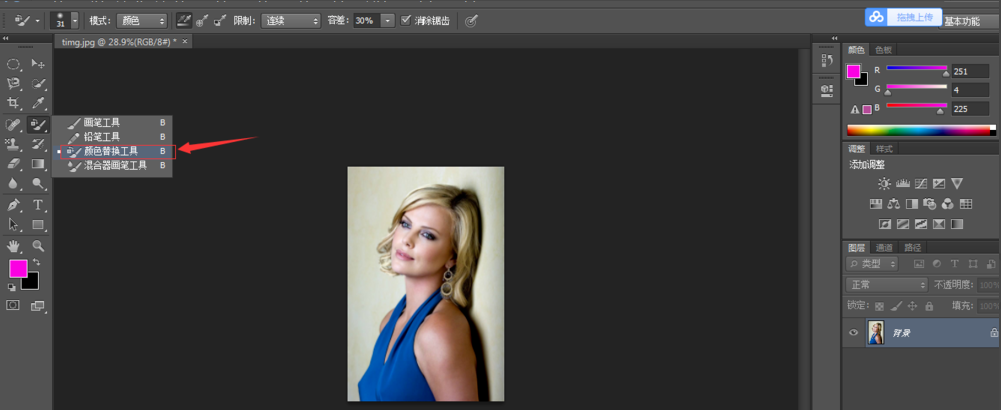 如何对图片部分区域进行调色?这是让很多人比较困扰的一个问题,其实不难,可以选择的方法也不少,本文详细介绍了使用Photoshop调整图片指定区域颜色的方法,一共两种,请参考。 如何利用PS修改人物衣服颜色? 方法一 打开Photoshop软件,导入一张图片,选择前景色为想要替换成的颜色,这里我选紫红色,  在左侧工具栏中选择颜色替换工具,如图,  在上方工具栏中设置画笔大小、硬度、间距,选择模式为【颜色】,限制为【连续】,容差为20%,如图,  用颜色替换工具在衣服上进行涂抹,可以发现衣服颜色变成了前景色的颜色,注意,涂抹的时候,画笔中心的十字位置只能碰到衣服,最终效果如图:  方法二 将图片导入PS软件,按【Ctrl+J】,复制一个图层,如图,  按【Ctrl+U】,打开色相/饱和度面板,点击【全图】,在下拉菜单中选择一个颜色,我选择蓝色,  将鼠标放到衣服上,此时的鼠标变成了一个吸管图标,可以吸取衣服颜色,选取要改变的颜色区间,  拖动【色相】下面的小滑块,发现衣服颜色会随之不停变化,选取合适的色相值,衣服变成了紫红色,点击确定,  使用蒙版工具,对图层建立图层蒙版,  选择黑色为前景色,调整画笔大小、硬度,在建立的蒙版上对除了衣服之外可能变色的部分进行涂抹,露出下层图层原本的颜色,  衣服颜色修改完成,效果如图。  如果你想了解更多有关PS图片调色教程,可以关注wmzhe.com。 毁誉参半拼音:huǐ yù cān bàn释义:说坏话的和说好话的各占一半。表示对人的评价没有一致的意见。出处:茅盾《温故以知新》正常的现象是毁誉参半。这个毁誉参半……会争出一个对作品既不偏高,也不偏低的恰好评价。”示例:无 PS调整图片指定区域颜色,先说两种方法落慢条斯理人不可貌相落大方如果相信轮回,对缘分就不会感到奇怪。因为人与人之间的关系并非始于今生,还有许多前生带来的烙印。在过去生,有些曾是我们的亲朋故友,有些则是我们的冤家仇敌。当彼此在今生再度相遇,这种烙印就会复苏,并驱使我们将往昔的爱恨情仇继续演绎下去。55. Many people are becoming aware of the importance of exercising.220.回眸一笑百媚生,六宫粉黛无颜色。《长恨歌》 浣溪沙 晏殊083李白:行路难三首之二PS,Photoshop,调色One can infer from the survey’s results that a full one - third of the respondents may have viewed the current benefits package unfavorably. |