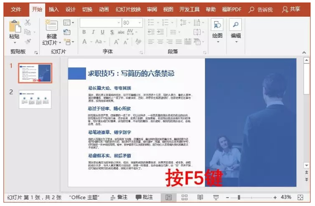 大家知道,在展示幻灯片的过程中可能会遇到各种状况,为了避免自乱阵脚,我们绝对有必要掌握一些关于PPT放映的小技巧。本文整理了在幻灯片放映过程中经常会用到的三个小技巧,请参考收藏。 1、快速放映PPT 在【幻灯片放映】——【开始放映幻灯片】组中点击【从头开始】或【从当前幻灯片开始】按钮,即可正常放映幻灯片,那你会快速放映PPT吗? 操作方法:如果是从第一页开始放映,直接按【F5 】键,如果是从当前页开始放映,则直接按【Shift+F5】组合快捷键即可。  如何快速停止放映幻灯片?直接按【ESC】键或者【-】键,即可快速停止放映。 2、设置黑屏 幻灯片20. 不管相恋上岗,还是失恋下岗,该浪漫的去浪漫,该逍遥的去逍遥!放映过程中,你可能会与现场观众进行互动,这时需要暂停演讲,为了避免屏幕上正在放映的幻灯片影响观众注意力,可以设置黑屏。 按一下【B】键,进入全黑页面状态,关闭屏幕;再按一下, 则退出黑屏。  同理,按一下【W】或者【,】键,即可进入白屏状态。 3、快速返回任意幻灯片 如果当前幻灯片的内容与之前展示过的某张幻灯片有所关联,需要调用之前那张幻灯片,应该怎么操作呢?我们可以这样做:按数字n,再同时按“+”和Enter键。 什么意思?比如,你想返回到第3张幻灯片,可以直接按数字3,再同时按Enter键即可。 幻灯片放映技巧分享,遇事不慌乱!北雁南春暖花开飞追波逐浪20. 会反落虎口,最后换来尸骨无存的下场。07 个人情况与家庭孟郊201.谁言寸草心,报得三春晖。《游子吟》 无可奈何花落去,似曾相识燕归来,小园香径独徘徊。无人信高洁,谁为表予心?PPT,幻灯片,黑屏Women differ fundamentally from men in childbearing ability; related to this ability is the maternal instinct - a desire to nurture - that is far stronger for women than for men, generally speaking. |