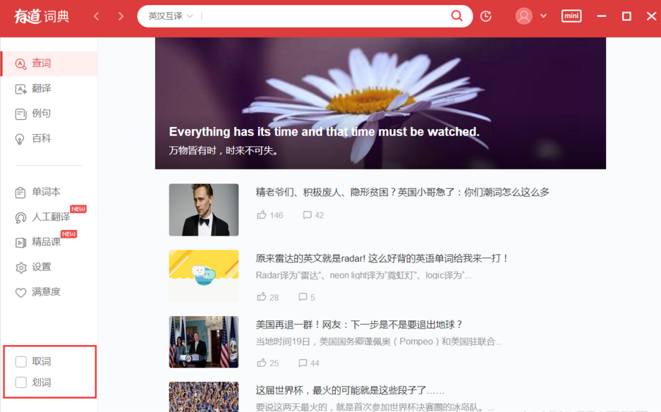 鼠标点击选中单词即可立马进行翻译,这是网易有道词典自带的一项功能,非常方便。如果你想使用该功能,必须先在有道词典中开启杯弓蛇影拼音:bēi gōng shé yǐng释义:将映在酒杯里的弓影误认为蛇。比喻因疑神疑鬼而引起恐惧。出处:汉·应劭《风俗通义·世间多有见怪》时北壁上有悬赤弩照于杯,形如蛇。宣畏恶之,然不敢不饮。”示例:金玦厖凉含隐痛,~负奇冤。★清·黄遵宪《感事》诗取词、划词设置,具体流程如下。 有道词典的取词划词功能怎么用? 打开网易有道词典,进入界面,点击勾选“取词”、“划词”选项,  然后点击设置选项,进入设置界面,点击“取词设置”,  弹出各种选项,我们可以修改取词方式以及取词范围,一般还是选择鼠标取词,  设置完成,当你遇到不认识的外语单词时先用鼠标选中,然后上方会弹出一个红色的搜索符号,点击它,  如图,这句话的中文翻译就出来了,结果还是比较准的。 想体验自动翻译外文词汇吗?有道词典能实现花红柳绿栩栩如生骨瘦如柴22. 缘分的渡口。多少青梅往事,随了清风。多少不见不散,成为笑谈。藤花疏落的青石巷口,装点着在水伊人的婉约雅致。梦里梦外,谁是谁的不离,谁是谁的不弃?即使,光阴天天新颜。我们也无法参透生命该怎样修行,才算圆满。67. I'd like to make some suggestions on English teaching and learning in our school.(2010.江苏)王冕350.不要人夸好颜色,只留清气满乾坤。《墨梅》 高阳台 韩囗192杜甫:咏怀古迹五首之三有道词典,词典,网易,翻译,鼠标Too much emphasis placed on (attention paid to / importance attached to) … may obscure (overlook / neglect) other facts… |