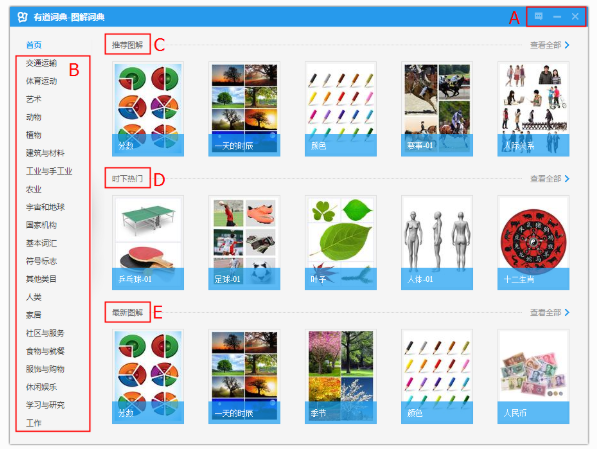 有道词典是由网易官方推出的一款翻译软件,支持多国语言互译,功能强大。有道词典中有一个“图解词典”功能,有些小伙伴还没用过,那我们今天就来着重介绍图解词典。 有道词典中的图解词典功能怎么用? 打开有道词典,在底部工具栏中点击对应图标,或者在查词结果页面点击“去图解词典”,都可以开启图解词典功能,  进入图解词典功能界面,小编进行了细致分类,如图,  A、意见反馈、窗口最小化、关闭图解词典 B、49. 工作上的不如意是正常的,暂时的挫折会很快过去的,有我在支持着你,作你的后盾,还有咱们深情伟大的爱,你还怕什么,一切困难都是能够觖决的。词条一级分类:共21个大类别,覆盖各个领域常用词汇。选择某一类别,可以看见该类别下的词条二级分类。  C/D/E首页推荐:分别是首页推荐图解、时下热门、最新图解,默认显示5个,可点击查看全部推荐。  A、点击放大图片。 B、鼠标选择部位:给出该部位单词,右侧对应显示该单词释义。 C、查看详细释义:点击回到有道词典查词页,查看更多详细释义。 关于有道图解词典的功能介绍就到这里了,如果你有其他疑问,欢迎留言。 有道词典之图解词典功能应用教学,请查收自风雨同舟郁郁葱葱命不凡57. 有人爱雾,爱它的朦胧,爱它的缥缈;有人爱霜,爱它的洁白,爱它的淡雅;也有人爱露,爱它的晶莹剔透,爱它的娇小玲珑;更有人爱雪,爱它的纯洁,爱它的素雅。be ready to do sth 准备做某事汤显祖367.良辰美景奈何天,赏心乐事谁家院。《牡丹亭》 天涯情味,仗酒祓清愁,花消英气。西山外,晚来还卷,一帘秋霁。136刘长卿:寻南溪常山道人隐居有道词典,词典,翻译There were 100 traffic accidents in April, and increase of 5 percent in a five-month period. |