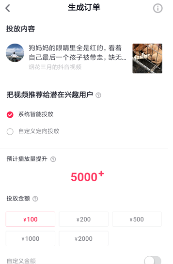 抖音App中新增了一个Dou+功能,它可以帮助大家上热门,让你的视频作品火一把。下面小编来介绍Dou+功能的具体使用方法,请看文章介绍。 抖音dou+是什么?怎么使用? 打开抖音App,找到想要推广的视频作品,在视频播放界面点击【转发】按钮。  进入转发界面,点击【dou+】选项。  接着进入生成订单界面,这里默认的是系统智能投放,目前来说,一百块钱可以获得5000左右的播放量提升。  当然,我们也可以32. 恋爱就像一所学校,失恋就像是毕业了一样。毕业了不需要伤心,需要做的仅仅是回味过去的时光,总结过去日子里所学的恋爱方式和技巧就是最好的缅怀。自己选择推荐视频的用户,点击【自定义定向投放】。  下方出现几个选项,可以选择性别、年龄以及区域,选择完毕、点击【支付】,我们的抖音视频就能获得推广了。  简单来说,抖音dou+功能就是用来推广视频的,但它不是免费的。 启用抖音dou+功能,让你的视频火一把目春光月出东山明媚瞪口呆16. 每天改变一点点,我们的每一次小小的努力虽然看不出有明显的变化,但是,“积土成山,集腋成裘”,量变的过程中必定会迎来质的飞跃。are addicted to:对......入迷12.为山九仞,功亏一篑。 凭谁为歌长恨?暗殿锁、秋灯夜语。叙旧期、不负春盟,红朝翠暮。江流天地外,山色有无中。抖音,视频In the first place, a great deal of empirical evidence shows that sequels are often not as profitable as the original movie. |