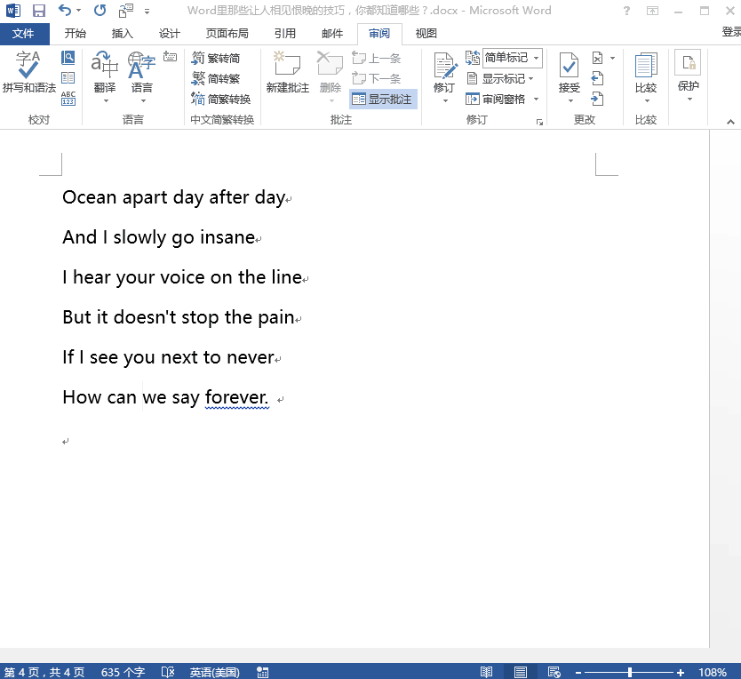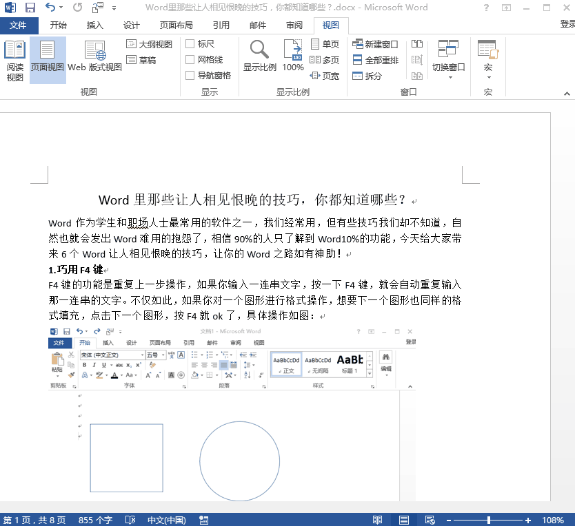 天天都用Word办公,自然是要让其发挥最大作用,Word中的便捷操作你是否都会用呢?下面介绍一些Word操作技巧,第一时间学会才行! 1、巧用F4键 F4键的功能是重复上一步操作,输入了一连串文字,按一下F4键,就会自动重复输入那一连串的文字。不仅如此,如果你对一个图形进行格式操作,想要下一个图形也有同样的效果,点击下一个图形,按F4就行了。  2、删除多余空行 Word文档中出现多处空行,你还在一处一处地删除吗?完全可以利用替换功能来一步完成!点击【查找】-【高级查找】,选择【替换】-【特殊格式】中的【段落标记】,在输入框中输入两个段落标记(^p^p),在“替换为”中输入一个段落标记(^p),点击【全部替换】即可。  3、生僻字、英文看不懂 拿到一个Word文档,里面有不认识的生僻字,Word可以当你的语文老师,点击【开始】选项卡下的【拼音指南】,Word就自动帮你把拼音拼出来了,是不是很酷!  看不懂英文单词怎么办?点击【审阅】-【翻译】-【翻译屏幕提示】,就可以实现一秒翻译单词了!  4、分屏功能 想将一份文档上下对照进行查看,需要用到Word分屏功能,再也不用把鼠标滚来滚去了!  5、Word文档一键转PPT Word想要转成PPT,先要通过【文件】-【选项】-【快速访问工具栏】-29. 人生难免要遭遇挫折与失败,与其用泪水洗刷悔恨,不如用微笑去迎接新的挑战。【不在功能区的命令】-【发送到Microsoft PowerPoint】-【添加】-【确定】,把图标先固定在页面的上方。  想要快速生成一份结构清晰的PPT,就需要选择【视图】-【大纲】,进入大纲后,再给你的文本设置一下大纲的级别。设置成功,点击左上角的小图标,一份PPT就自动生成了,比复制粘贴方便多了。  6、Ctrl+字母快捷键 Word作为文字处理工具,当然少不了快捷键操作,这里列举了常用的Ctrl系列快捷键,让你分分钟变身文字达人! Word中这些便捷操作你会吗?赶紧用,别浪费风万里无云真才实学云变幻35. 如果一个男人总是让你觉得自己不正常,那说明你们是两个世界的人,天生就不就应在一起。何必在爱情的幻想中纠结不已,弄得血肉模糊。15. We should get into the good habit of using our time wisely.司马迁《史记》97. 人固有一死,或重于太山,或轻于鸿毛。 清平乐 晏几道散入珠帘湿罗幕,狐裘不暖锦衾薄。Word,文档,翻译,分屏,PPT,快捷键,鼠标For the reasons given above, I feel that… |