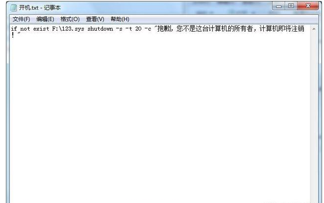 很多小伙伴有给电脑设置开机密码的习惯,但这种方式很容易被破解。为了有效保护电脑中的隐私信息,我们可以给电脑加一把“钥匙”,今天小编就教大家把U盘设置为电脑开机钥匙! 如何将U盘设置为电脑开机钥匙? 1、首先一定要确定U盘盘符。将U盘插入电脑,确认U盘盘符(我的盘符是 F:)。这一步很重要,如果把盘符弄错了,电脑将在每次开机后自动关机。  2、在U盘里创建一个文件,文件名和扩展名都可以随意命名,比如创建的文件为123.sys ,注意,sys是文件的扩展名!  3、在电脑C盘新建记事本:开机.txt,然后输入if not exist F:S.sys shutdown -s -t 20 -c "抱歉,您不是这台计算机的所有者,计算机即将注销!",随后保存并重命名为开机.bat。   注意:其中“F:”为自己U盘的盘符。根据自己电脑的实际情况,修改U盘盘符。“123.sys”是你在U盘上自定义的文件名和文件扩展名。“shutdown”是Windows自带的关机小程序。 “-t 20”是指等待10秒,整句程序的意思是,如果U盘(盘符为F)上没有名为“123.sys”的文件,则20秒后自动关闭该计算机。 4、按Win+R,在弹出的“运行”里输入"gpedit.msc"并按回车打开组策略。在左侧导航栏中依次打开,“计算机配置&rdqu14. 生活中少不了不如意,每每这时不妨想想自己那甜如蜜的爱情、深如海的亲情、醇如酒的友情,拥有这些还不够吗?其实,这些才是自己最坚固的后盾。o;-“Windows设置”-“脚本(启动/关机)”。鼠标右键右侧的区域里“启动”选项-“属性”- “添加”-“浏览”-选择刚刚创建的bat文件-单击“打开”-最后点击“确定”。  现在只要重新启动电脑就可以了,下次开机的时候,必须插入你的U盘才能进入系统,否则电脑就出现下方提示并在20秒后自动关机! 如果U盘丢了怎么办? 1、找另外一个U盘,在U盘建一模一样名字的文件,插入电脑重新开机。 2、开机后,按照第4步的步骤,打开启动的属性,把bat文件删除即可。 用U盘给电脑上锁,比开机密码更高级倾千差万别国倾刀山火海城18. 愿我的生命也是这样的,没有大多绚丽的春花、没有太多飘浮夏云、没有喧哗、没有旋转的五彩,只有一片安静纯朴的白色,只有成熟生命的深沉与严肃,只有梦,像一样红枫那样热切殷实的梦。67. I'd like to make some suggestions on English teaching and learning in our school.(2010.江苏)176.不敢高声语,恐惊天上人。《夜宿山寺》 池塘水绿风微暖,记得玉真初见面。重头歌韵响琤琮,入破舞腰红乱旋。君不见,青海头,古来白骨无人收。电脑,U盘,密码,开机,关机Without such evidence, we cannot accept the author’s conclusion that no government funds should be directed toward maintaining the Styx River bridge. |