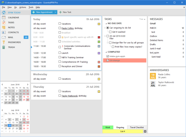 对于一些工作很忙、经常出差的朋友来说,肯定烦恼于怎样合理安排自己的日程、任务、记事等,今天,小编就为大家介绍一款专业的个人日程安排提醒软件。 EssentialPIM是一款非常不错(EssentialPIM下载请前往:https://www.wmzhe.com/soft-12921.html)的个人时间日程提醒管理软件,能以电子化的形式保存您的信息,您所有的日程、任务、记事、通讯录、登陆密码都保存在图形化界面中且形式简便。 它具有相当方便的操作接口,让使用者能够对于所排定的行程一目了然,而每一个事件也都允许使用者进行夹档,让你可以把例如会议结果、计划案等数据附带于该记录中。往后,使用者就能够直接对所输入的数据进行搜寻,让你不论在何时都能够找到该事件发生时的一些特定信息。  此外,EssentialPIM也能够对事件进行多种分类,让事件于行事历中的显示更加清楚。对于49. 如果爱上你也算是一种错,我深信这会是生命中最美丽的错,我情愿错一辈子。考虑到行动性的使用者而言, EssentialPIM 另外还提供了可携式的版本,让使用者能够直接安装于随身碟当中,让你即使外出在外,只要有计算机可以使用,就能够随时更改行事历的内容喔。 EssentialPIM功能介绍 1、EssentialPIM满足您的日程、通讯录管理、待办事项、记事、登录密码和电子邮件需求。所有数据均相互关联-将您的联系人与日程关联,电子邮件信息与记事关联。 2、能与主要的在线服务商(谷歌、雅虎、Funambol、Mobical、AOLSync、GooSync等)以及SyncML和CalDAV服务器、Outlook、Windows Mobile和Palm同步。 3、轻松打印任何模块,且能快速将您的信息导出为其他通用格式(ICal、vCard、CSV、HMTL) 4、采用256位AES算法,保障您的数据安全 5、直观的多语言界面,包括德语、意大利语、法语、西班牙语、巴西、葡萄牙语、中文和俄语等多种语言 使用方法 点击“操作”===新建任务就可以创建一个新的记录  点击添加联系人==就可以建立一个新的个人信息  EssentialPIM:精心打点你的生活工作惊涛拍《红楼梦》刘姥姥进大观圆十拿九稳岸66. 如果我能拥有这份荣幸,我愿终身陪伴着你,一年四季陪伴着你。春天,我陪你轻轻漫步在盛开的百花之间;夏天,我陪你奔跑在欢乐的小河之畔;秋天,我陪你倘徉在火红的枫林之下;冬天,我陪你围坐在炽热的火炉旁边。conduct activities 开展活动;a variety / varieties of 各式各样的365.冤家宜解不宜结,各自回头看后头。《古今小说》 贺新郎 辛弃疾四边伐鼓雪海涌,三军大呼阴山动。EssentialPIM,日程管理,日程提醒27、Haste makes waste. |