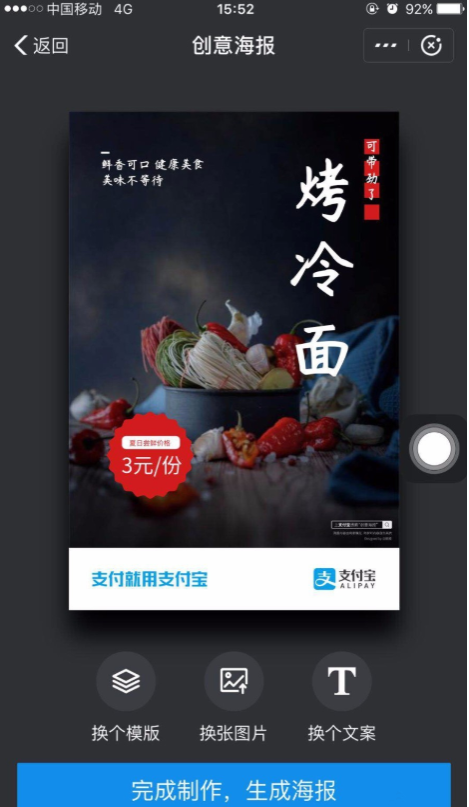 支付宝中新推了一项“创意海报”服务功能,集合了各种类型的海报模板。下面我们简单说说支付宝创意海报功能的使用方法,请看文章介绍。 如何用支付宝制作创意海报? 打开手机支付宝,进20. 人生没有彩排,每天都是直播;不仅收视率低,而且工资不高。入首页,在顶部搜索框中输入“创意海报”。  找到之后,打开该应用就可以看到专属海报制作,点击“立即制作”按钮。  此时可以看到各行业的专属海报模板,选择你喜欢的。  调整好图片、文案,点击“完成制作,生成海报”。  制作完成,下载该海报即可,也可以购买海报邮寄到家里。 用支付宝可以制作海报,方便又快捷一秋风送爽大惊失色览无余28. 那个男生,的确是一个能够让女孩子永远心生恐惧的人。起初是殷勤,殷勤到了能够当街跪下给你系鞋带的地步。经常很委屈,觉得自己的付出没有回报。很不安,觉得没有办法把握我。很善变,看了我的文字觉得那里面都是我的故事(这是最让人没有语言的事情)。之后就是争吵,之后就是争吵……我从来没有和男人吵过架,他是第一个,每吵一次就是一种很恶心的回忆。之后才明白,这样轻慢的感情不是爱。虽然我没有爱过他,但是一向在迁就,有时候也觉得自己不正常,但是迁就只能让他更加觉得自己是受害的。我不知道你是否方便多告诉我一些有关旅行的事。贺铸326.试问闲愁都几许?一川烟草,满城风絮,梅子黄时雨。《青玉案》 衣上酒痕诗里字,点点行行,总是凄凉意。红烛自怜无好计,夜寒空替人垂泪。269李白:下江陵支付宝,海报There is little doubt (no denying) that serous (special / adequate / immediate /further) attention must be called (paid / devoted) to the problem of … |