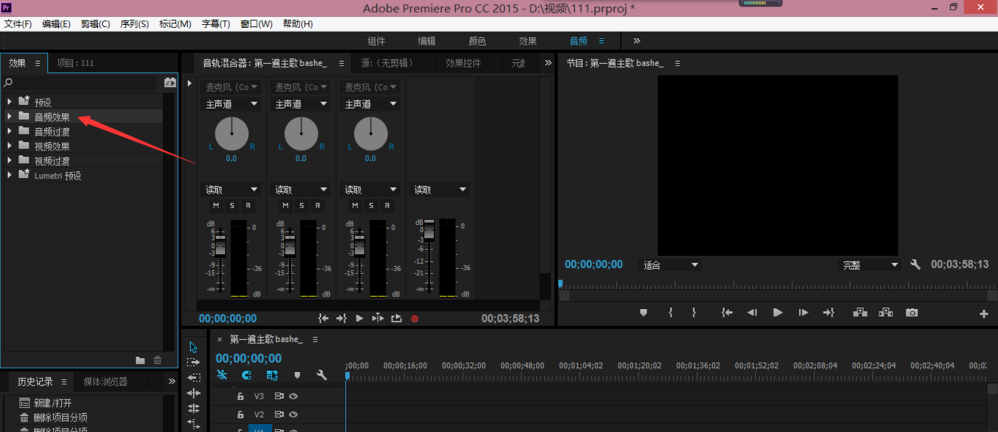 点击工具栏的“音频”,找到右边“效果”下的“音频效果”,