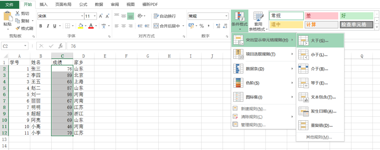 EXCEL是我们办公必备的一款软件,我们在操作过程中应该熟练掌握一些它的使用技能,会明显提高你的工作效率,减少加班时间。对于刚进入职场的小白来说,可能还不清楚EXCEL的使用技巧,在此,我列举EXCEL使用中常用的几个技巧,也欢迎大家继续补充和完善。 1、VLOOKUP VLOOKUP公式必须首选!简直神器!第一次用的时候就被它强大的功能吸引住了,后来发现它基本上是我工作中使用频率最高的一个公式。 VLOOKUP函数是一个纵向查找函数,按列查找,最终返回该列所需查询列序所对应的值;与之对应的HLOOKUP是按行查找的。 这样看太费事,我们直接举个简单的例子方便理解吧。 如下图,我们这里有某一个班级所有学生的成绩单,工作簿命名为“全班成绩”。  而此时,我们需要知道下面几位同学的成绩。  此时,VLOOKUP公式就派上了用场。我们可以在B2输入以下公式: =VLOOKUP(A2,全班成绩!A1:B12,2,0) “A2”(张三),就是要查找的值。在实际工作中,因为有重名的可能,所以可以用学号或者工号作为唯一标识。“全班成绩!A1:B12”,即选中了“全班成绩”工作簿中的所有数据,从A1到B12。“2”,表示匹配“全班成绩”工作簿中的第二列。“0”,表示精确匹配,也可以选择“1”表示近似匹配或模糊匹配,一般情况下选择“0”即可。 输入完这个公式,点击回车,张三的成绩就出来了,然后将鼠标放在单元格的右下角,出现黑色十字符号的时候,双击或者下拉菜单,剩余几名同学的成绩也全都出来了。 2、数据透视表 数据透视表也是我工作之后才知道的一个技能,也算是使用率非常高的一个神功能了。数据透视表可以动态改变数据的版面布置,按照不同的方式分析数据。 我们还是以刚才那个数据为例,不过新加了一列“家乡”,如下图所示:  如果我们要统计出各个地区的平均成绩,就可以用数据透视表迅速地做出来。首先,在数据区域任何一个单元格点击一下,然后点击“插入”中的数据透视表,如下图:  点击之后会出现一个对话框,点击确定,就会跳到EXCEL另起的一个工作簿中:   此时,就要好好使用右面标红区域了。我们将“家乡”拖入“行”区域内,将“成绩”拖入“值“区域内。  此时我们可以看到已经初步地出现了我们想要的一个效果。现在的问题是,在“值”这一列,EXCEL自动处理为求和,而我们想要的是平均数。 在右下角的“值”区域里,点击一下,选择“值字段设置”,如下图:  会弹出一个汇总方式的对话框,选择“平均值”,之后再设置一下“数字格式”,如保留两位小数之类的,点击确定即可。  3、冻结窗格 在一页工作簿中,如果行数或者列数过多,一旦向下滚屏,则上面的标题行也会跟着滚动,在处理数据时往往难以分清各列数据对应的标题,此时冻结窗格就派上了用场。这里依然用我们原来的数据举例。不过,为了让数据稍微复杂点,我们再次增加一列“学号”。  点击视图中的“冻结窗格”,我们会发现有三个选项:  分别是“冻结拆分窗格”、“冻结首行”、“冻结首列”。后两个应该不用我多讲大家也都能明白,就是将表格的第一行或者第一列冻结。这里着重讲一下第一个“冻结拆分窗格”。  如上图,假如我想同时冻结首行和前两列(即A列和B列)该怎么办?此时就可以用“冻结拆分窗格”。先选中C2,即张三的成绩“76”这一个单元格,然后点击冻结拆分窗格,效果就实现了。 4、求和及平均数 毋庸置疑,求和和求平均数是工作中经常需要使用的,公式也很简单,sum和average。这里要说的是,如果你只是单纯地想看这两个结果的话,那么只要将数据全选,右下角就会自动出现求和和平均数,不用再去使用公式额外计算了,省事又省力。  5、筛选 筛选的重要性不言而喻,假如我们要筛选出山东的考生,那么选中第一行任意一个单元格,点击“开始”中的“排序和筛选”,或者使用快捷键CTRL+SHIFT+l,之后点击单元格下的下拉箭头,即可筛选。在下拉箭头下,不仅可以筛选,还可以(学习更多excel小技巧,访问wmzhe.com)进行排序。  6、条件格式 条件格式也是一个非常有用也很常用的工具,字面上理解,就是EXCEL会根据你所限定的条件,将符合条件的数据标记出来。我们这里举一个简单的例子,假如要标记出高于80分的成绩,我们可以先选中所有的成绩,然后点击“条件格式——突出显示单元格规则——大于”,在弹出的对话框中输入80,所有大于80的成绩都会自动标记出来。   也可以在“新建规则”中自己建立各种各样的规则,如排名靠前三的成绩或者大于平均值的成绩等,怎么用怎么爽。 以上60. 不敢说我会等你一辈子,因为我没有几个四年可以去耗费。但相信我会爱你一辈子,因为你给我的没有人能再给我。就是小编分享的几个Excel使用小技巧,欢迎补充。 几个使用率较高的Excel小技巧,告别小白转赤日炎炎光芒万丈危为安传说有一种感情,纯纯似云,交错地美丽。像望不断的山水,袅袅;依依!79. Good habits are the crosscut to success.朱柏庐《朱子家训》374.一粥一饭,当思来处不易;半丝半缕,恒念物力维艰。 鸳楼碎泻东西玉。问芳踪、何时再展?翠钗难卜。待把宫眉横云样,描上生绡画幅。怕不是新来妆束。彩扇红牙今都在,恨无人解听开元曲。空掩袖,倚寒竹。流传汉地曲转奇,凉州胡人为我吹。EXCEL,Excel技巧There are numerous reasons why …, and I shall here explore only a few of the most important ones. |