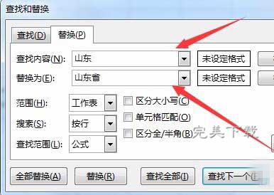 在进行Excel操作使用的过程中,有时候会需要对工作表中的多处数据内容进行修改处理,一个一个操作实在是不方便,有什么办法可以快速更改多个数据呢?今天,小编就给大家介绍下Excel2016中怎么快速更改多个数据,有需要的参考下。 Excel2016中怎么快速更改多个数据? 1、打开要修改的工作薄,发现在多个工作表中在山东后面漏掉了一个省字,逐个修改工作效率会很低  2、这时我们点击开始工具栏上的“查找和选择”下拉菜单,在弹出菜单中选择“替换”菜单项  3、在打开的查找和替换窗口中,我们在查找48. 你的快乐,我独家赞助:你的痛苦,我独家承受;你的脾气,我独家承受:你的一生,我独家陪伴。内容处输入山东,在替换为输入山东省  4、接下来我们点击“范围”下拉菜单,在下拉菜单中选择“工作簿”菜单项  5、然后再点击“全部替换”按钮  6、这时就会弹出替换完成的图片,直接点击“确定”按钮就可以了。  7、到工作表中可以看到,所有的错误都已修改正确了  8、如果还有更复杂的替换内容的话,可以通过点击查找和替换窗口中的“格式”按钮,设置复合条件的方式就可以了 Excel2016工作表中对多处数据进行快速更改的方法千里三顾茅庐学无止境之行,始于足下47. 人生无处不是转弯的地方,只要我们还能走。幸运的是,我们能。即使前路艰险,孤身前行,也要坚定的相信。很多事也许结果并不像我们所期望的一样,但沿途的风景就已足够。记住青春时候的勇气,然后也更不在乎别人的否定。49. Littering makes our school dirty, and does harm to the image of our school. (2011.浙江)211.旧时王谢堂前燕,飞入寻常百姓家。《乌衣巷》 故园信息,爱渠入眼南山碧。念上国,谁是、脍鲈江汉未归客。身多疾病思田里,邑有流亡愧俸钱。Excel,Excel快速更改多个数据40、Desire has no rest. |