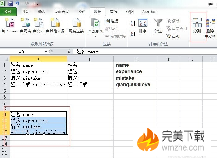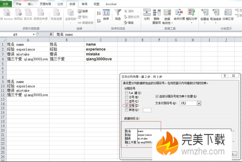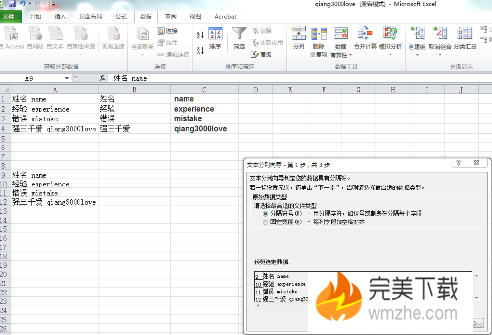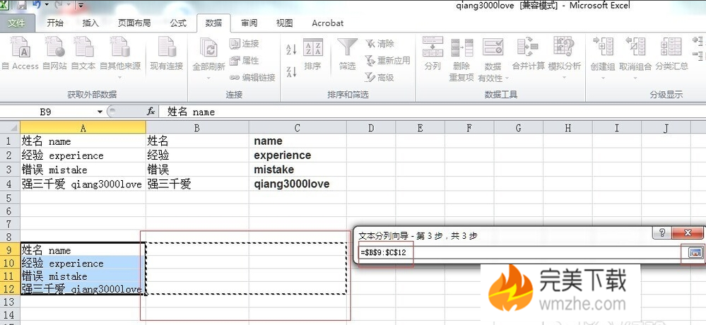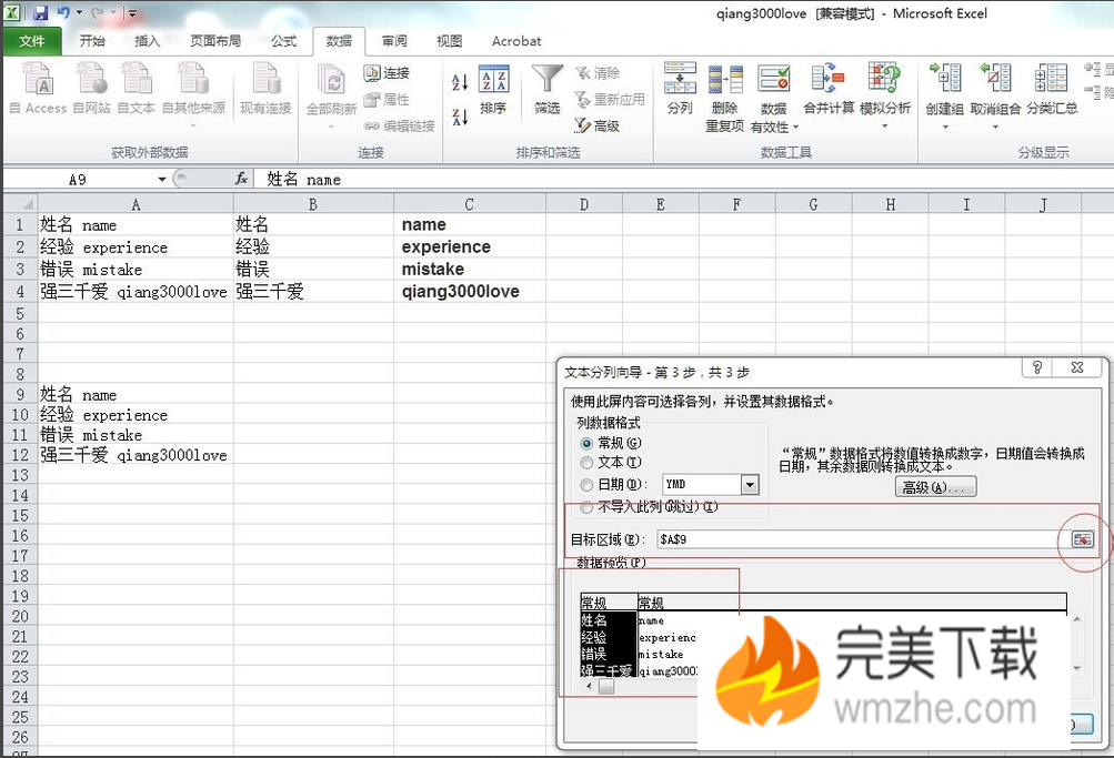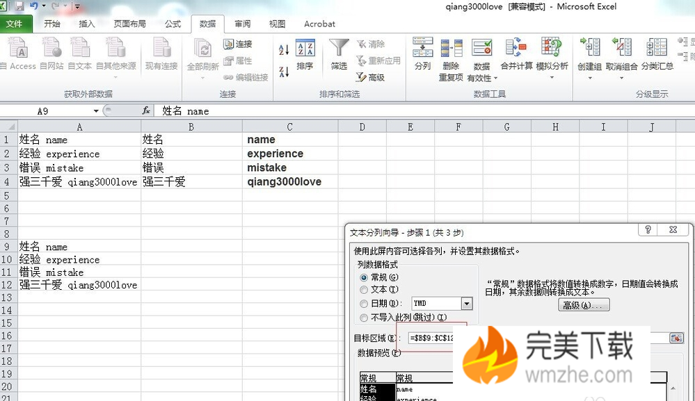 Excel办公软件可以处理各种不同的文字、数字,在编辑制作Excel表格的时候,我们有时候需要将单元格中的内容进行分离。简单来说,就是将一个单元格中的内容分离到另外两个单元格中,例如各种文字数字混合的情况下,今天将给大家分享两种方法,一种是LEN函数法,一种是自带功能法,以下是详细教程。 Excel2010如何将单元格中英文内容分离成两列? 方法一、使用LEN函数法 其用途:LEN 返回文本串的字符数 打开excel 2010文件,使用以下内容为例,如下图:  说明:LENB()函数,计算字符长度的时候,一个中文算做2,而1个英文和数字字符算做1;而LEN()函数,不管中英文,每个字符都算做1。 在B1中输入=LEFT(A1,LENB(A1)-LEN(A1)),按回车键,B1单元格将显示“姓名”,如下图:  在C1中输入:=RIGHT(A1,LEN(A1)*2-LENB(A1)),按回车键,C1单元格将显示“name”,如下50. 在遇到梦中人之前,上天也许会安排我们先遇到别人;在我们终于遇见心仪的人时,便应当心存感激。图。  将B1和C1选中,将函数公式往以下一拉,如下图:  这样就完成了单元格的中英文内容分离成两列的效果,如下图:  方法二、使用软件自带的功能“分列”法。 1、将数据复制到A9-A12,如下图:  2、将excel2010上方的选项卡,切换到”数据“,找到”分列“图标,选中A9-A12的数据,如下图:  3、单击”分列“图标,将会弹出新的窗口,如下图:  4、选择”分隔符号(D)“,点击”下一步“,出现新的界面,如下图:  5、在”空格“前方打钩(备注:若是其他字符将中英文分开,就选其他),点击”下一步“,出现新界面,如下图:  6、在”目标区域(E)“选择分离后内容放置的位置,点击”目标区域(E)“同行最右侧的表格图标,出现新的窗口,可进行区域选择,本次选择B9-C12,如下图:  7、目标区域选择完后,按回车键,又回到原先的界面,但目标区域位置改变了,如下图:  8、点击”完成“,在B9-C12的位置会出现分离的数据,如下图所示。 Excel2010:将单元格内容分离成两列真才如风景如画花似玉实学54. 若心存完美,必定处处春暖花开。缘分的转角处,总有一些不经意的遇见,唯美了旅途的风景。总有一些擦肩而过的缘分,陪我们走过了一程山水,在下一个路口又各道珍重。也有一些入心的情,沉淀在内心丰润了流年,装饰了美丽的梦。繁芜之中,留住本真,以一颗安静的心,去看待人生的聚散离合,心存完美,更胜春天。62. It is my / an honor to be here to share with you my opinions on what to learn in senior high school.(2014.江西)《管子》29.仓廪实则知礼节,衣食足则知荣辱。 三姝媚 史达祖春城无处不飞花,寒食东风御柳斜。Excel,Excel内容分离The increase (change / failure / success) in… mainly (largely / partly) results from (arises from / is because of)… |