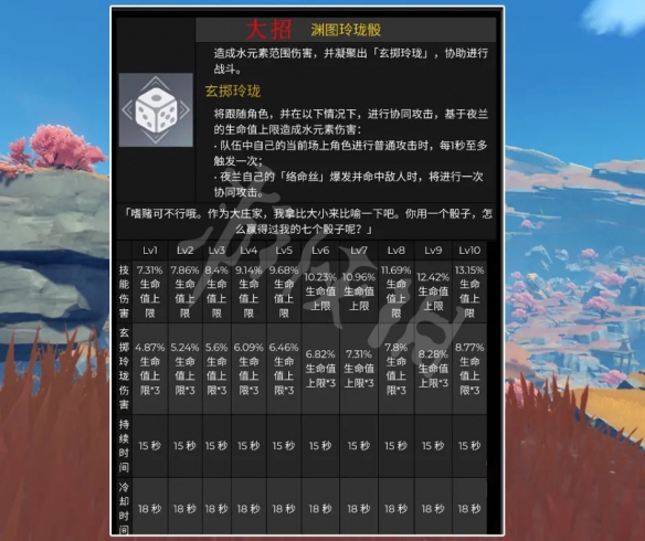 一般打击 调剂了普攻第4段危险,从3个数值调剂为2个数值。没有过那个调剂出甚么意义。果为夜兰是副C脚色,用没有上一般打击。  E妙技:萦络纵命索 面按,快速背前徐走1段间隔。 少按,延续徐走3秒,能够按住圆背键掌握徐走圆背。 徐走路子标志的仇人,徐走完毕引爆,制成火元素危险。 徐走相似早柚的E妙技,但延续工夫较短,热却工夫较少,用赶路其实不真用,妙技危险基于死命值,10级40.7%死命值上限。 热却工夫10秒,属于对照短的,没有浑楚规复能量怎样。  年夜招:渊图小巧骰 元素能量70 开释刹时制成火元28. 繁复没有是少,而是出有过剩,充足也没有是多,而是恰好您正在。素局限危险,并取得「玄掷小巧」结果,协同当脚色打击 延续制成火元素危险,便是出手背景挂火输出妙技。跟止春1样。 妙技危险战延续危险皆是基于死命值,由此得出,夜兰次要叠死命值属性,「玄掷小巧」延续危险,每秒触收1次,每次3段火元素危险,延续15秒,那1共能够挨出45段火伤。  猜先有圆:多元素步队,进步夜兰死命值,便是提拔本身危险。 妙转随心:年夜招时代提拔当前脚色制成的危险,最多进步50%,属于删伤妙技,提拔夜兰帮助才能。  中心命座:1命、2命战4命 1命删减1次E妙技。2个E是否是能够刹时开年夜招呢。 2命年夜招时代每1.8秒触收1枚飞弹,制成14%死命值的火元素危险,年夜招15秒便是删减8枚飞弹。战初初版本对照,下降了危险,删减了飞弹数。 4命E妙技标志仇人提拔齐队死命值,最多进步40%,那个对夜兰本身提拔没有错,其他脚色,胡桃靠打击力是靠死命值转化,战胡桃便十分符合,,拆配夜兰挨副C, 6命开年夜招落后进「运筹帷幄」结果,普攻换为「破局矢」危险,延续20秒,射击5箭后移除,因为有打击次数的限定,即便6命也没有能当主C。 原神2.6夜兰技能介绍 新角色夜兰技能一览阳春三月震耳欲聋微乎其微流年,在辽远深邃的意念中,逍遥在无法把握的虚境,柔情万缕逃逸着现实,辗转在缥缈的梦中,在迷离和清晰里,绵绵絮语。目前我们已经开展了各种各样的英语学习活动。罗贯中《三国演义》355.滚滚长江东逝水,浪花淘尽英雄。是非成败转头空。青山依旧在,几度夕阳红。(卷首语) 风入松 吴文英黄叶仍风雨,青楼自管弦。原神2.6夜兰技能介绍,新角色夜兰技能一览,单机游戏攻略,游戏新闻,游戏图片,游戏视频26.live not to eat,but eat to live. 活着不是为了吃饭,吃饭为了活着。 |