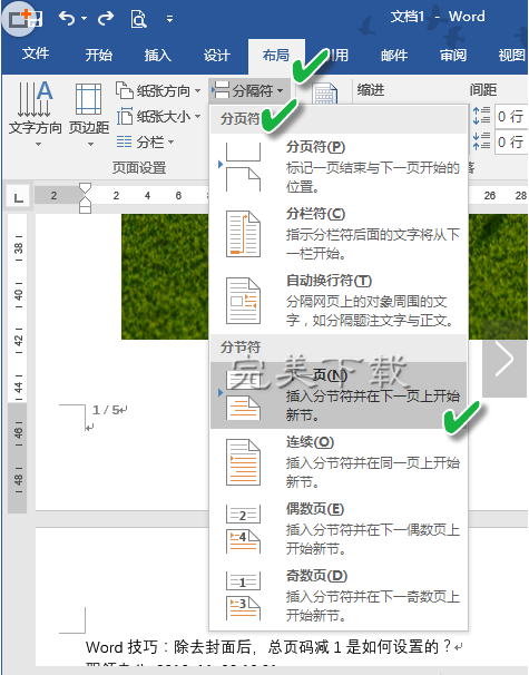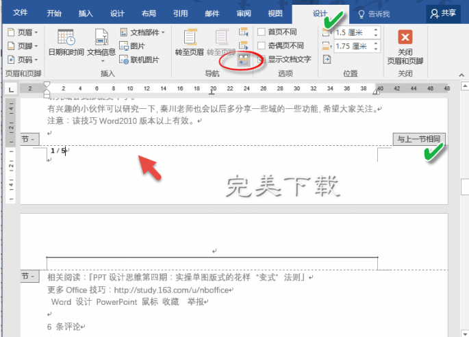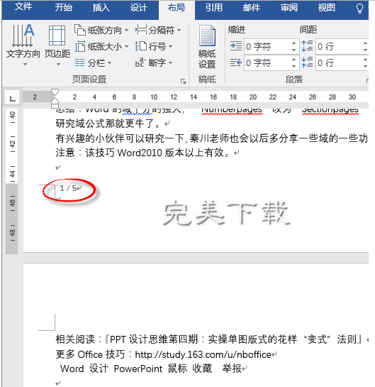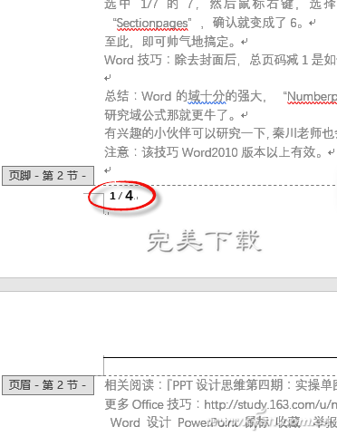 我们在对Word 文档进行排版的时候,很多时候都会插入页码,往往在插入封面后,封面之后的页码就成了第2页。封面上标了页码不合常规习惯,因此有不少人问,如果封面不标注页码,且封面不算入页码总数,正文如何从第1页开始标注页码呢? Word2016排版正文页码如何从1开始计数?  其实这个问题可以借助于“节”及其属性延续的设置来搞定。在上图的版面中,将光标打到封面图片之后,依次选择“布局→分隔符→分节符→下一页(插入分节符并在下一页上开始新节)”。  之后我们看到,文档的第239. 被人讨厌时就是被人讨厌,被人腻烦时就是被人腻烦,但你的自身价值并不因此而下降。就算被人甩了,也别像被贬值了似的唠唠叨叨。页,也就是正文的第1页的页码不再是第2页,而也变成了第1页,说明已经实现了从1重新计算页码的目的。  那么,封面下方难看的页码如何去除呢?这时不能贸然去第一页中删除页码,因为下一页的页眉页脚属性目前处于“与上一节相同”状态,若是删除了,则正文中的页码也没有了。这时需要将光标定位于第二页的页脚,然后通过“设计”菜单中的“链接到前一条页眉”按钮,将与前一页的页脚的属性关联“斩断”。  之后,将光标打到封面的页脚处,依次点击“设计→页码→删除页码”。这样封面的页码就去除了。  删除封面页码之后,再回到正文第1页末端查看,发现页码依旧完好存在且是从1算起的,符合要求。 从上面的案例可以得到启发:如果在一个大文档中需要给每个章节(或某个特殊章节)单独设置重新计数的页码,使用“节”分隔符,之后再将其与前一节的关联去除,就可以独立设置自己的页码了。 但是,细心的你可能已经发现,页码的总数没有减去封面的1页,最后一页的页码变成了4/5,那么5/5这页哪里去了?这好像有点不合乎逻辑。如何更正呢?我们只需选中页脚页码区域 1/5 的5数字,鼠标右键单击,选择“编辑域”,然后将“Numberpages”改为“Sectionpages”。  确认之后就会发现,文档的总页码就由5变成了4,最后一页的页码也变成了4/4,封面页显然已经不再包含在内了,这样就合乎逻辑了。  最后总结一下,另类的页码定义需要用到“节”、“节属性延续设置”、“页码域编辑”这三个概念。掌握了这3个东西,再难的页码你都可以搞定的。3把钥匙已经交给你,你没问题了吧! Word2016:正文从第1页开始标注页码得意洋洋洪水猛千军万马兽47. 这句话仿佛是一束温暖的阳光直射我的心田,抚慰了我受伤的、幼小的心灵。69. For one thing, reading literary books help to improve my writing skills and broaden my horizons. For another, they can enrich my life.(2012.江西)龚自珍384.我劝天公重抖擞,不拘一格降人材《己亥杂诗》 月有阴睛圆缺,此事古难全。但愿人长久,千里共婵娟。五月西施采,人看隘若耶。Word,Word排版14.A journey of a thousand miles begins with a single step.千里之行始于足下。 |