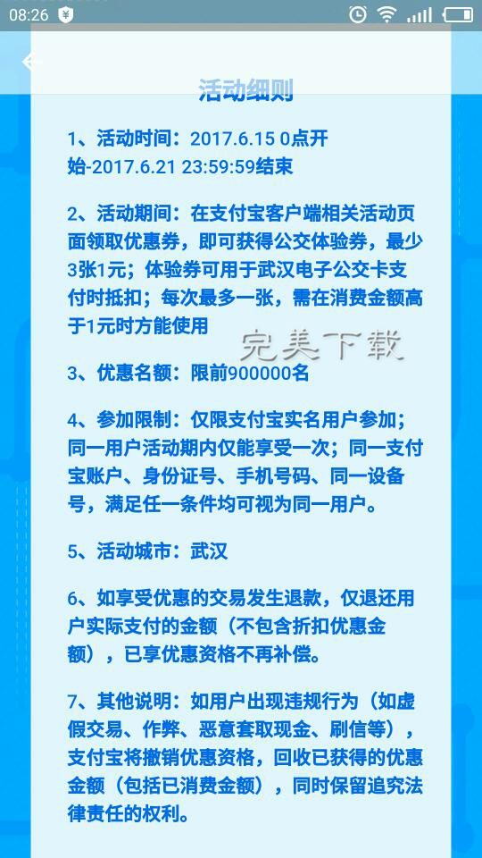 支付宝的服务功能是越来越便捷了,用支付宝领取公交卡,即可刷手机坐公交了。近日,支付宝宣布武汉公交成为“无现金支付”的第一站,用户通过支付宝可以免费领取武汉电子公交卡,享受先乘车后付款的优惠服务。那么支付宝怎么免费领取电子公交卡呢?一起来看看吧。  蚂蚁金服公共事业部相关负责人表示,领用武汉电子公交卡,可成为公交会员,在这一会员系统里,将不定期推出优惠模式,有望实现享受乘公交免交通罚单、商业、旅游打折等优惠。 登支付宝免费领用武汉电子公交卡,享更多优惠寒冬腊碧空画蛇添足如洗月16. 指尖跳动,舞蹈在自我的世界,而心被风吹拂着,在微凉的红尘深处,一枚青苔滋生的记忆弥漫着。就我而言,我赞同…的观点81.民为贵,社稷次之,君为轻。 永遇乐 刘辰翁不敢长语临交衢,且为王孙立斯须。支付宝16、As heroes think, so thought Bruce. |