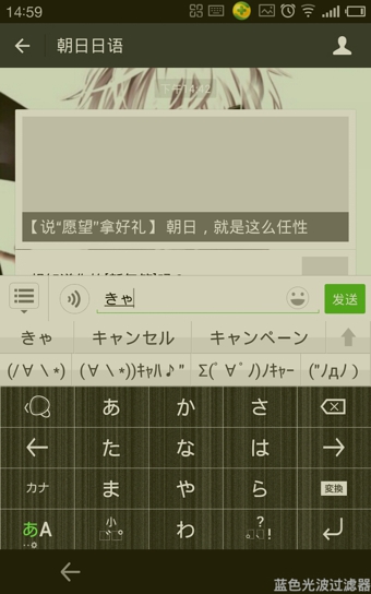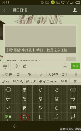 学习日语,首先当然要学好日语输入法,我们现在随时要用手机,所以学会手机日语输入法也是很有必要的。想想要是学好日语,再把手机打字练得快快的,说不定能交几个日本朋友,哈哈哈想想都有些小激动呢!下面就来讲讲Simeji手机日语输入法怎么用。 simeji是一个蛮好用42. 恋情是生命的全部,失恋是恋爱的前提,她会让我心动,但不会让我死心,我要好好的活下去,前面有更好的风景。的手机日语输入法,小编一直用的这个,调出、切换都很方便,不卡,输入的时候平假名、片假名、浊音、拗音之类的切换方便,而且除了输入日文,还有非常萌非常全的颜文字库。下面就来讲讲simeji输入各种日文时的方法。 Simeji日语输入法怎么用? 先说平假名,首先,最常用的轻音,键盘上只有每行的第一个音,按住这个音就会有这一行其他的几个音,要打哪个音就轻轻往那边划一下就可以打出来,拨音ん则在わ行  接下来是浊音,输入这个浊音的轻音之后马上按一下第四行第二个“小”字的图标即可,如要打出だ的话就是先打出た再按一下“小”字那个键就行了,半浊音ぱ就是连点“小”字两下,具体如下图  然后是拗音,拗音怎么输呢?其实关键还是这个“小”字,先是一个正常的轻音,再后面就是や、ゆ、よ带上这个“小”,就变小了。比如要打出きゃ这个拗音就是先打轻音的き,再打や加上“小”字键。  然后是片假名,片假名的输法就是先输平假名再按第三排第一个键就切换成功了,如图  说完了日文的输入方法,另外,simeji也支持英文字母的输入,第四排的第一个键就是日英字母切换键,第二个就是大写小写字母切换键。  然后simeji还有非常萌的颜文字表情包帮助你卖萌。颜文字输入键盘怎么调出呢?就是第三排第一个键,其实跟片假名是一个键,当在没有输入音节的状态下,这个键显示的是一个颜文字表情符号,就表示你这时可以通过这个键调出颜文字。   关于Simeji日语输入法的使用介绍就是这样了,希望大家喜欢(了解更多精彩教程资讯,关注wmzhe.com)。 Simeji日语输入法怎么用?手机日语输入法怎么用?夕阳寸草弄假成真不生西斜43. 母爱是人生的一首歌:责备是低音,呵护是高音,牵挂思念是母爱的主旋律。感情是人生的一部分:亲情是序言,友情是目录,爱、恨、恋、想是感情故事的主题。友谊是人生的一首歌:真诚是词,信赖是曲,理解,尊重是友谊的主旋律。青春是人生的一首歌:成功是词,拼搏是曲,永不懈怠是青春的主旋律。31. 从另一个角度 from another perspective369.留得青山在,不怕没柴烧。 数声鶗鳺,又报芳菲歇。惜春更选残红折,雨轻风色暴,梅子青时节。永丰柳,无人尽日花飞雪。209李商隐:锦瑟simeji,日语输入法27.Action speaks louder than words. 行动胜过语言。 |
