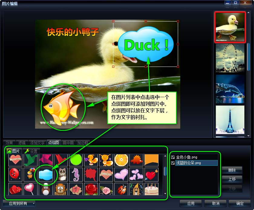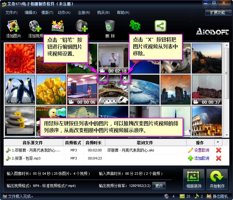 艾奇KTV电子相册制作软件可以把您的照片和视频配上音乐和歌词字幕,制作成各种格式的视频电子相册。让你的电子相册或者卡拉OK视频更具有别具一格的风格,那匹配这个电子相册的图片肯定也要非常的漂亮了,怎么用艾奇ktv电子相册制作软件制作出非常精美的图片呢?今天给大家分享的是艾奇ktv电子相册制作软件制作图片教程,方法不是很难,步骤有点繁琐,大家可以看看,希望能帮助大家制作好看的相片或者图片哦! 艾奇ktv电子相册制作软件制作图片的教程 第一步:打开软件,然后通过双击添加到列表中的图片,或者点击"铅笔"按钮可以进入图片编辑界面。  第二步:点击”效果“标签——在效果标签内可以根据用户自己需求对每个单独的图片过渡效果、显示方式、展示时长、过渡效果时长等参数进行调整。默认的参数是“模版”所提供标准效果。  第三步:点击”滤镜“标签——可以通过“勾选”操作,对图片进行各种角度的旋转、翻转操作,也可以选择黑白效果等滤镜效果。  第四步:点击“添加文字”标签——在文本输入框输入文字,点击“添加文本”按钮。文字会出现在画面中,可以多次操作添加多行文字。选中文本列表中的某行文字后可以在列表右侧的各种选项中给文字设置字体、字号、字形、颜色、描边等参数。  第五步:点击“点缀图”标签——在“点缀图”标签,可以给当前的图片添加一个或多个装饰图。通过鼠标拖拽添加的装饰图图片外的框体可以进行移动和缩放操作。在其中的“设置”标签中可调整装饰图图片的轮廓、边框、透明度等参数设置,调整后可直接看到调整效果。   第六步:点击“画中画”标签——在“画中画”标签,可以在当前的图片嵌入其他图片,实现“画中画”的效果。点击右侧的“导入图片”按钮,选中要嵌入的图片即可。通过鼠标拖拽添加的图片外的框体可以进行移动和缩放操作。在其中的“设置”标签中可调整图片的轮廓、边框、透明度等参数设置,调整后可直接看到调整效果。  第七步:点击“加边框”标签——在下方的边框列表中点击选择一个边框图来装饰当前图片,软件自带一些边框图。如果需要更多边框可以通过点击右侧的“更多边框”按钮,在官网下载更多边框进行安装。用户也可以选用自己的.PNG格式的透明边框图,只需把自选的边框图片文件复制到软件安装目录下的“pictures --> rim”文件夹内,重新运行软件即可。  功能提示:图片编辑界面的底部“应用到所有”菜单。可以把以上所有针对某个图片的编辑操作,应用到列表内的所有图片上。例如:用户添加导入了100张图片,需要给所有图片添加上同样的文字,那么用户只需对某一张图片进行了“添加文字”设置,通过“应用到所有”按钮。把当前的设置自动复制到其他99张图片上,无需逐一操作。 艾奇ktv电子相册制作软件制作图片的教程见识多(见多识广)龙马精举不胜举神31. 海浪不回避礁石的撞击,才得以壮观;人生不拒绝遗憾的存在,才得以明达。对于该问题的看法因人而异。148.绿树村边合,青山郭外斜。《过故人庄》 夜游宫 吴文英昔有佳人公孙氏,一舞剑器动四方。艾奇ktv电子相册制作软件,电子相册制作Although many people believe that …, I doubt (wonder) whether the argument bears much analysis (close examination). |