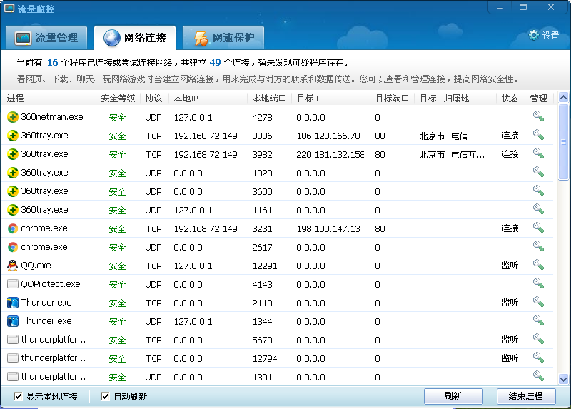 如今网络信息错综复杂,可以说是没有100%安全性可言,很多软件在下载的同时总会顺带做一些小动作,比如说在后台偷偷上传/下载数据,不仅影响网速,导致网速很慢,严重的是还有可能会泄露用户隐私、丢失帐号信息,造成财产损失。 一款简单有效的网络监控工具能够帮助我们查看系统的网络使用情况,360网络流量监控工具就可以做到,360网络流量监控工具是从360安全卫士里分离提取出来的一个绿色小工具,可以列出当前电脑所有联网的程序,显示上传/下载速度、统计流量、查看连接IP/端口等信息,甚至还能限制网速、禁止软件联网等功能。  在360网络流量监控工具的流量管理中能够清晰的了解到有哪些程序正在使用网络,让那些偷偷占用资源的程序无处隐藏,如果发现了拖慢整个网速的软件,可以点击右键对软件进行限速或者禁止它们联网,以绝后患,此外,在软件右下角显示实时网速的监视悬浮窗,可以让你时刻了解到网速的占用使用情况。  在网络连接功能里,所有进程的基本信息一览无遗:本地 IP、本地端口、目标 IP、目标端口、目标地理位置(IP 归属地) 以及连接状态等信息,同时方便你对进惠而不费拼音:huì ér bù fèi释义:惠给人好处;费耗费。给人好处,自己却无所损失。出处:《论语·尧曰》因民之所利而利之,斯不亦惠而不费乎?”示例:谁知庄大老爷这笔款项情愿报效,只代子弟们求几个保举,更是~的事。★清·李宝嘉《官场现形记》第十五回程进行排查,这个功能也可以查看当前系统全部的 TCP 和 UDP 网络连接。 有了360网络流量监控工具中的网络流量监控以及网络连接查看两个功能,那些偷偷占用着网络资源的软件就都能轻松处理掉了,相信你的电脑网速也能提高不少。 限制软件网速/网络连接查看——360网络流量监控工具井井有丽日临空条风雨交加29. 取一枚青苔寄予流年,于月影下,静听远古传来的吟唱,这是生命中从没有体验过的一种精神快感。72. Some people think that we should read extensively.356.万事俱备,只欠东风。 贺新郎 刘克庄荒戍落黄叶,浩然离故关。流量监控,360网络流量监控工具,360安全卫士42、One is never too old to learn. |