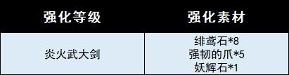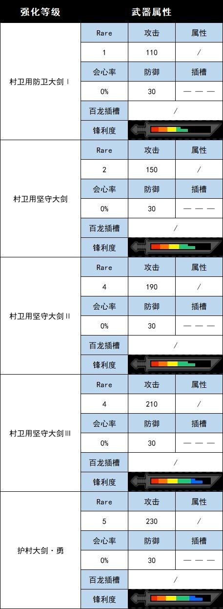 年夜剑 村卫用兵器衍死 村卫用年夜剑中不雅以下。  村卫用年夜剑的各强化品级战所需素材以下。  村卫用年夜剑的各强化品级属性以下。  烈焰衍死 烈焰年夜剑中不雅以下。  烈焰年夜剑的各强化品级战所需素材以下。  烈焰年夜剑的各强化品级属性以下。