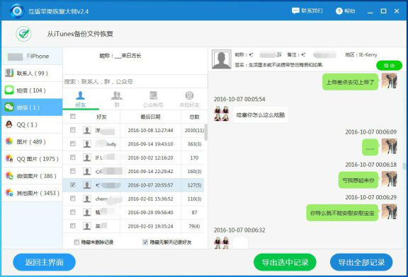 | 内容 | 现如今,各种聊天工具在我们的日常生活中占有一席之地,其中,微信已经成为大家手机必备的软件之一,我们都会使用微信进行语音聊天或者发送一些文字及图片信息。有时候,我们不小心把其中的聊天记录删除了,要如何恢复呢?接下来,小编就给大家介绍恢复微信聊天记录的方法,一起来看看吧。 ![]() 恢复微信聊天之前,首先要导出手机里面全部的微信聊天记录。通常情况下,要导出手机里面的微信记录需要先对手机进行Root处理。但是,若是直接借助天盾微信聊天记录恢复软件来提取恢复数据的话,就无需进行Root处理并支持一键导出功能。 恢复苹果手机微信聊天记录的方法 苹果手机用户想要恢复微信的聊天记录,我们可以下载互盾苹果恢复大师 1、因为互盾苹果恢复大师是通过电脑恢复手机微信聊天记录的,因此我们需要在电脑上下载安装“互盾苹果恢复大师”。 ![]() 2、将需要恢复微信聊天记录的苹果手机连接到电脑上,然后运行互盾苹果恢复大师,点击界面左侧的“从iTunes备份文件恢复”。这时候软件会自动检测电脑上备份的苹果手机数据。 ![]() 3、软件成功检测到手机后,请选择要恢复微信聊天记录所在的手机设备,然后点击“开始扫描”按钮进入文件扫描状态,我们等待软件扫描完成,就可以进行下一步操作了。 ![]() 4、软件扫描完成28. 简约不是少,而是没有多余,足够也不是多,而是刚好你在。后,点击软件左侧的“微信”选项,在右侧就会出现微信的所有聊天记录。 ![]() 5、然后勾选出自己想要恢复的微信聊天记录,点击“导出选中记录”,微信聊天记录就可恢复完成了。 ![]() 恢复安卓手机微信聊天记录的方法 如果安卓手机的用户想要恢复微信的聊天记录,那么我们可以选择下载互盾安卓恢复大师 1、因为互盾安卓恢复大师是通过电脑恢复手机微信聊天记录的,因此我们需要在电脑上下载安装“互盾安卓恢复大师”。 ![]() 2、将需要恢复微信聊天记录的安卓手机连接到电脑上,然后运行互盾安卓恢复大师,点击“开始连接”,软件就会自动扫描已连接的手机。 ![]() 3、当软件自动检测到一连接的手机时,就会出现手机相应的设备名称,选择完毕后,点击“下一步”。 ![]() 4、接下来是选择扫描的方式了,如果想要完整的恢复微信聊天记录,我们可以选择“深度扫描”最大限度找回删除的聊天记录。 ![]() 5、接下来软件就会开始自动扫描了,扫描完成后在软件左侧点击“微信”选项,然后勾选出自己想要恢复的微信聊天记录,点击“恢复选中文件”就可以恢复自己想要恢复的聊天记录了。 如何恢复删除的微信聊天记录?恢复微信聊天记录的方法龙变化多(千变万化)腾虎目不转睛跃9. 爱过的心总会有梦,流过的泪总有痕迹。所有会发生的一切,也许永远不能安宁。如果故事能够重演,你始终是我的唯一。能再次收到你的来信真是太好了。400.天若有情天亦老,人间正道是沧桑。《七律?人民解放军占领南京》 送陈君衡被召谁能绝人命,以作时世贤。如何恢复删除的微信聊天记录It is the belief in a brighter future that gives us optimism. |